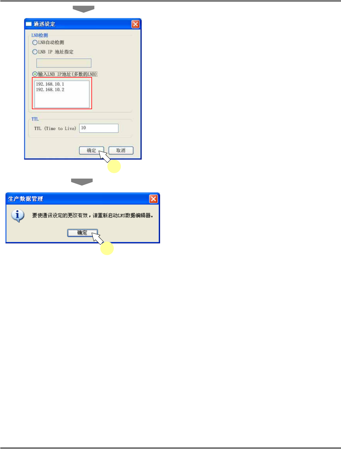 NPM-DGS 程序手册 10.3 关于 LWS 数据编辑器画面 EJS9AC-MB-10P-04 Page 10-11 指定 LNB IP 地址 ( 多个 LNB) 1 点击菜单栏的 [ 选项 ] [LNB 通讯设 定 ] 。 显示出 通讯设定 画面。 2 选择 [ 输入 LNB IP 地址 ( 多数的 LNB) ] 。 3 右击空白栏,选择 [ 新建 ] 。 显示 LNB IP 地址 画面。 4 输入…