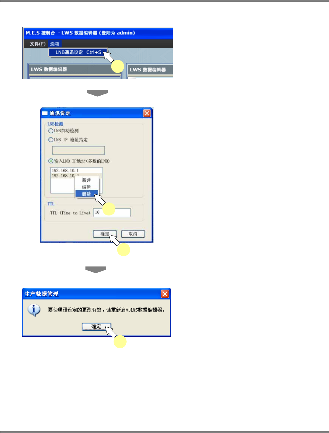 NPM-DGS 程序手册 10.3 关于 LWS 数据编辑器画面 Page 10-14 EJS9AC-MB-10P-04 编辑 LNB IP 地址 ( 多个 LNB) 1 点击菜单栏的 [ 选项 ] [LNB 通讯设 定 ] 。 显示出 通讯设定 画面。 2 从 IP 地址一览中选择需要编辑的 IP 地 址后右击,从右击菜单中选择 [ 编辑 ] 。 显示 LNB IP 地址 画面。 3 变更 IP 地址。…