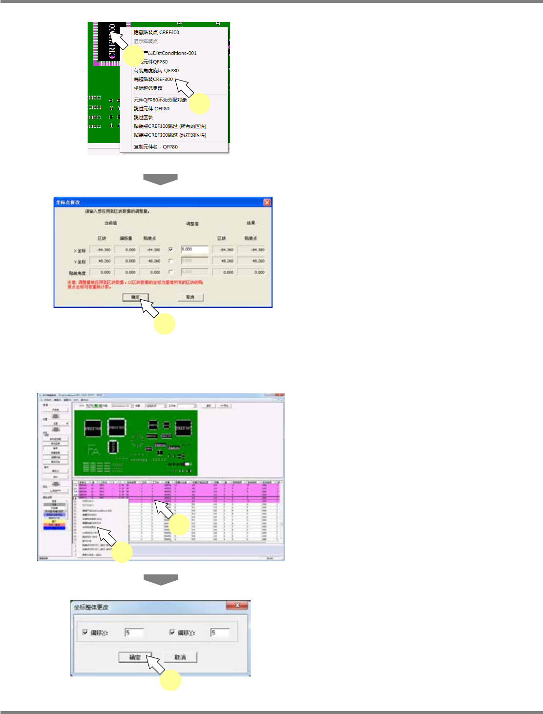 NPM-DGS 程序手册 10.4 生产数据的编辑 EJS9AC-MB-10P-04 Page 10-35 1 选择元件后,在元件上右击。 2 选择 [ 编辑贴装 XXXX] 。 显示出 < 坐标点修改 > 画面。 3 在需要调整的项目上打勾, 输入调整量 后,点击 [ 确定 ] 。 坐标整体编辑 可综合对象工作台、贴装头等的贴装 点后一起执行偏移。 1 从贴装点一览中选择需要偏移的贴装 点后右击。 2 选择 [ 坐…