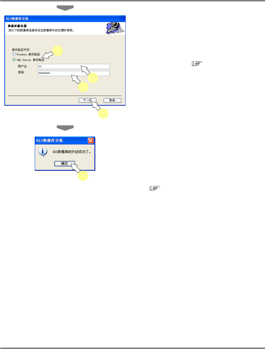 NPM-DGS 程序手册 2.2 DGS 应用程序的升级 Page 2-74 EJS9AC-MB-02P-03 3 在 ‘ 身份验证方式 ’ 下选择 [SQL Server 身份验证 ] 。 4 在 ‘ 用户名 ’ 中输入 ‘sa’ 。 5 在 ‘ 密码 ’ 栏里输入 ‘2.1.3 Microsoft SQL Server 2008 R2 SP2 Express 的 安装 ’ 中设定的密码。 6 点击 [ 下一步 ] 。 7 点击 [ …