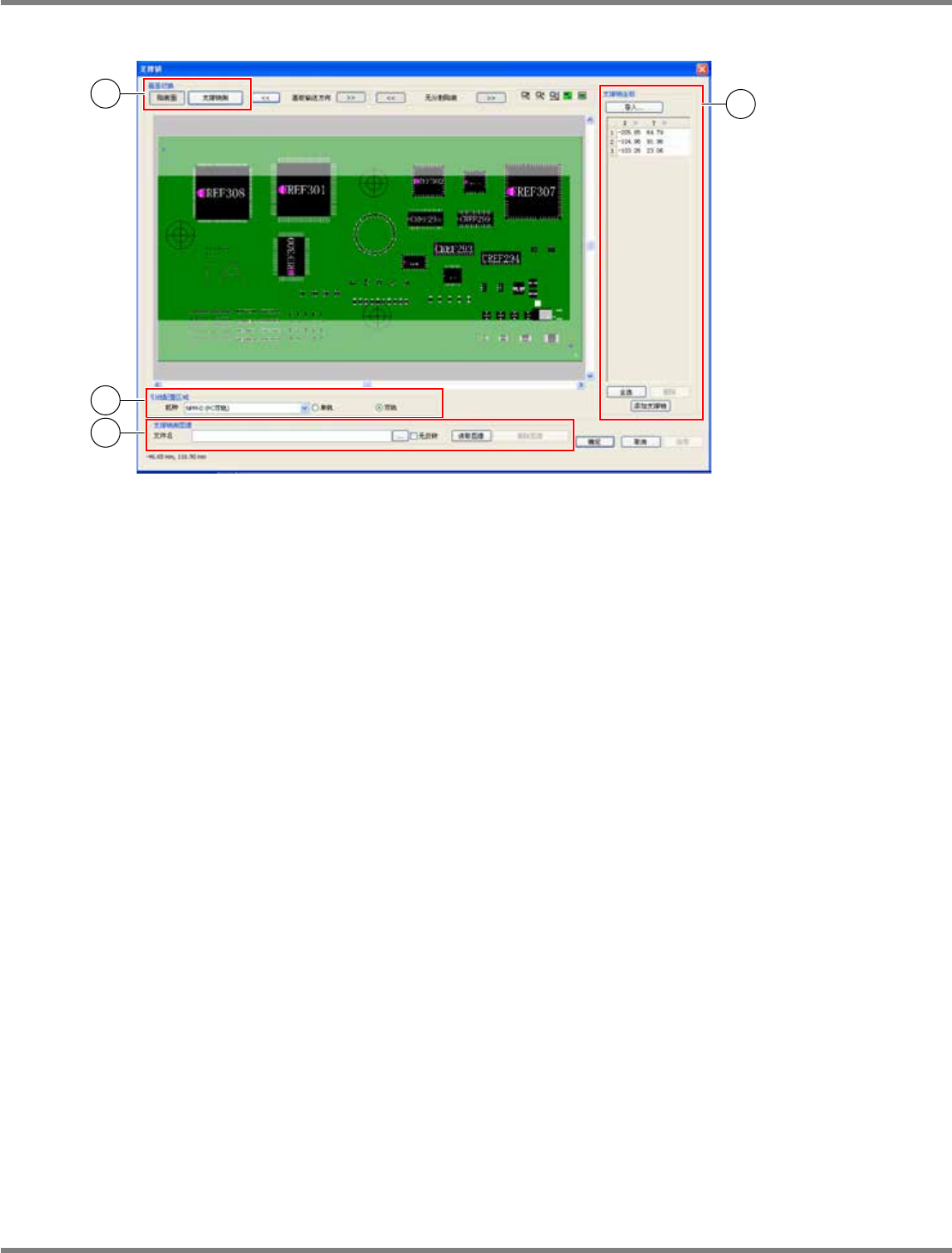 NPM-DGS 程序手册 13.2 支撑销配置数据的编制功能 Page 13-18 EJS9AC-MB-13P-07 支撑销画面的详细 ① ‘ 画面切换 ’ 切换显示画面。 [ 贴装面 ] : 将画面切换到贴装面。 [ 支撑销侧 ] : 将画面切换到支撑销侧。 ② ‘ 支撑销坐标 ’ 显示设定在基板上的支撑销的坐标。 [ 导入 ] : 从 PCB 或生产数据导入支撑销坐标。 [ 全选 ] : 选择全部的支撑销。 [ 删除 ] : 删…