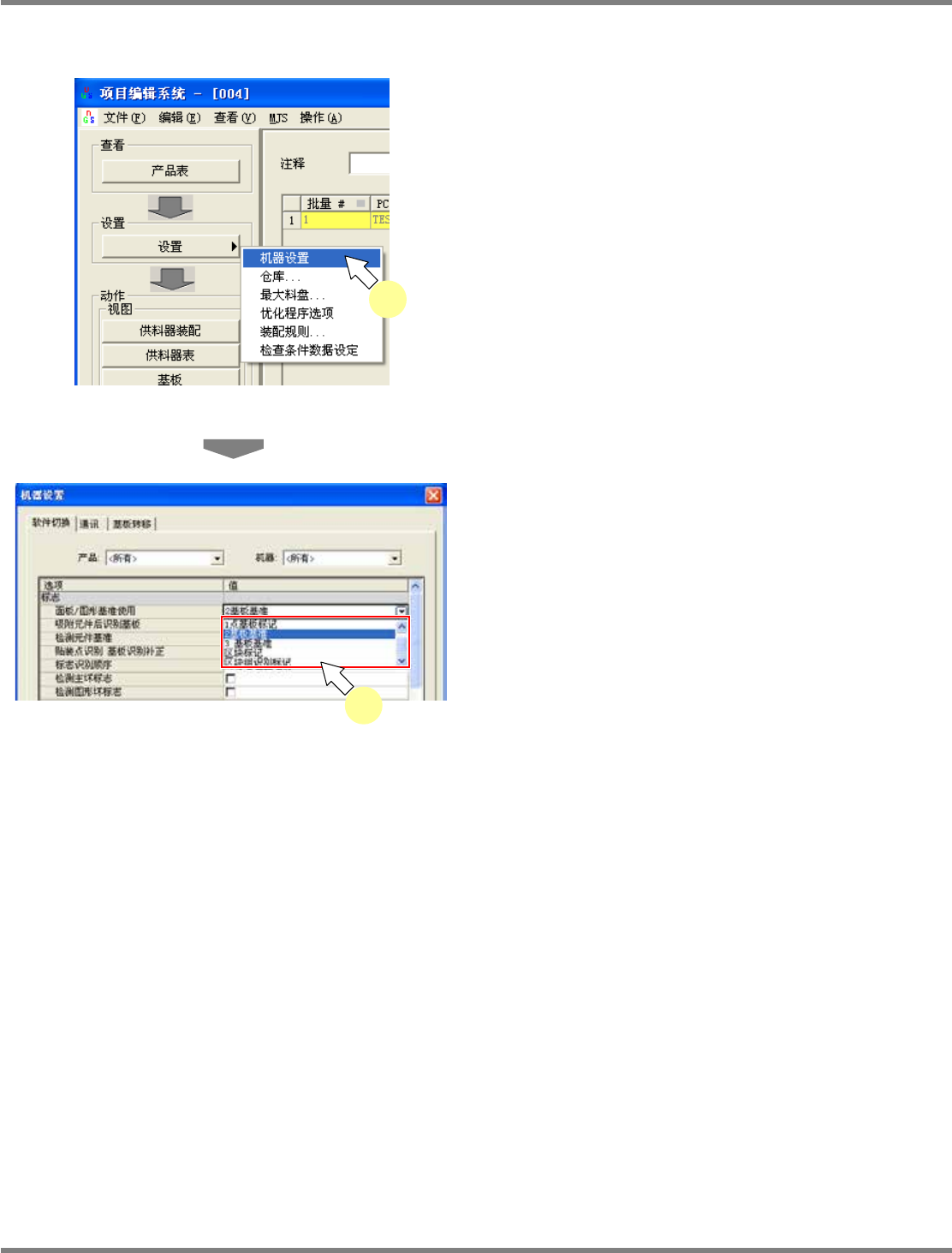 NPM-DGS 程序手册 13.3 大基板的贴装 Page 13-56 EJS9AC-MB-13P-07 识别方法的设定 ( 项目编辑系统 ) 1 在项目编辑系统下, 从项目栏的 ‘ 设置 ’ 中选择 [ 机器设置 ] 。 2 进行软件开关选项的 ‘ 基板 / 图形标 记的检测 ’ 设定。 基板尺寸、 基板识别标记数量会因机 种的不同, 而有所不同。 在进行分割贴装的机种下,请设定 2 点或 3 点 的基板标记。 在使用…