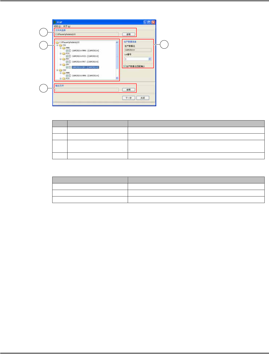 NPM-DGS 程序手册 13.5 SCAP (Special Convert A Panasert) EJS9AC-MB-13P-07 Page 13-73 关于程序信息画面 No. 项目 说明 ‘ 文件夹选择 ’ 选择进行转换的贴装程序。 ‘ 生产数据信息 ’ 显示所选择贴装程序的信息。 文件夹树状菜单一览 保存在通过文件夹选择所选择的文件 夹中的贴装机程序显示在 文件夹树状菜单上。 ‘ 输出文件 ’ 选择转换后…