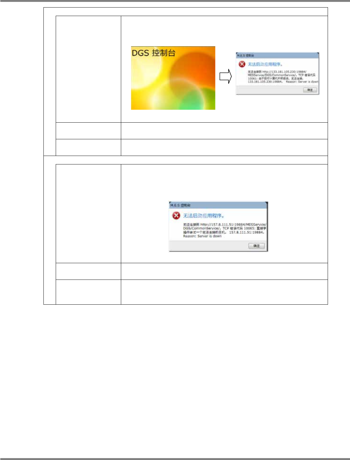 NPM-DGS 程序手册 14.1 故障排除 Page 14-6 EJS9AC-MB-14P-01 现象 : 在服务器客户端系统下, DGS 控制台画面显示超出 10 分钟,并无法启动应用程序。 错误信息 “ 无法连接到 http://(IP 地址 ):19884/MESService/DGS /CommomService/ 。 TCP 错误代码 10060 / 10061 : 由于目标计算机积 极拒绝,无法连接。 (IP 地址 ):1…