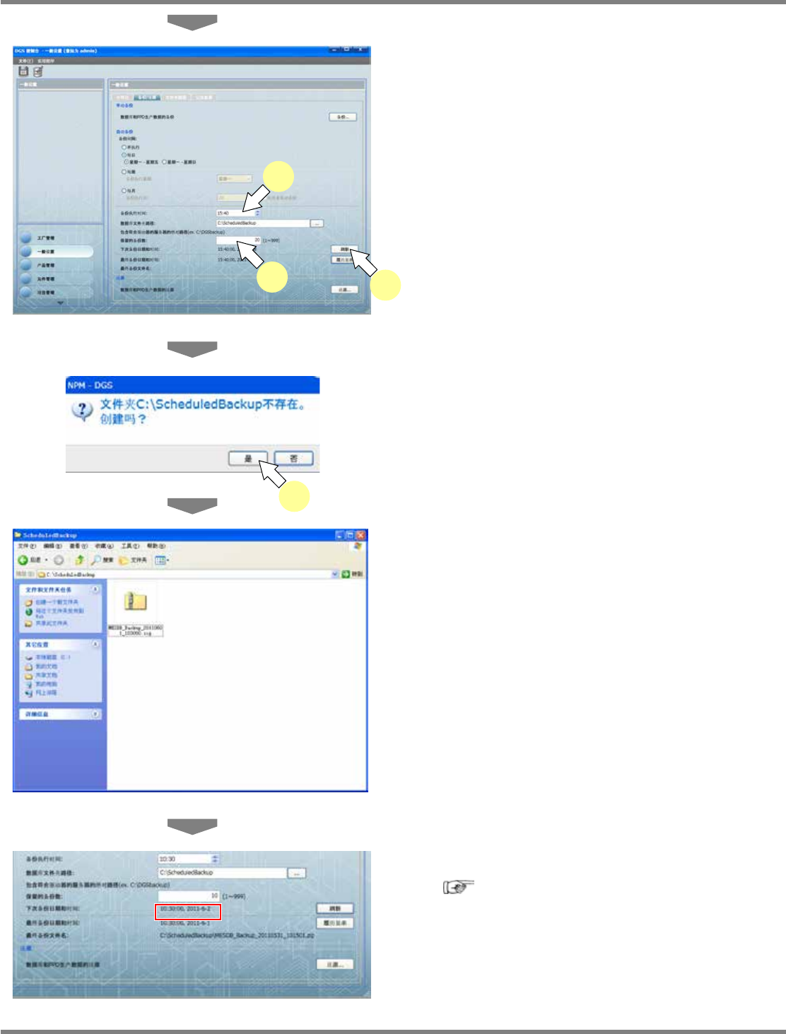 NPM-DGS 程序手册 3.2 关于环境设定画面 Page 3-16 EJS9AC-MB-03P-04 4 设定 ‘ 备份执行时间 ’ 、 ‘ 保留的备份数 ’ 后,点击 [ 刷新 ] 。 5 如果没有成功编制所设定的文件夹, 将 会显示确认对话框,这时点击 [ 是 ] 。 当所指定的备份日期到来时,即会自 动实施备 份并保存文件。 在没有打开电脑电源的情形下,不会 实施自动 备份。 即会更新下一次备份的日期,并将备 份信…