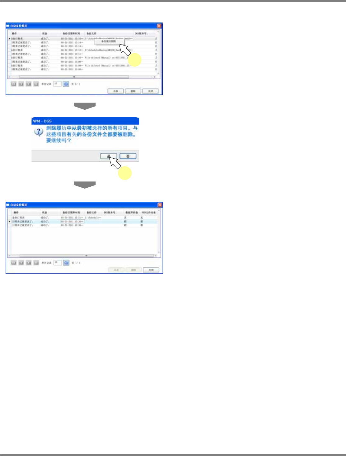 NPM-DGS 程序手册 3.2 关于环境设定画面 Page 3-20 EJS9AC-MB-03P-04 通过右击菜单删除 1 需要删除履历、 备份文件时, 从一览中 选择需要删除的项目后, 点击右击菜单 的 [ 备份履历删除 ] 。 2 将显示是否删除相关项目的确认对话 框,点击 [ 是 ] 。 从履历一览中所选择的备份文件和与 履历相关 的项目即会被删除。 Environment03 0103S-18C00 1 Enviro…