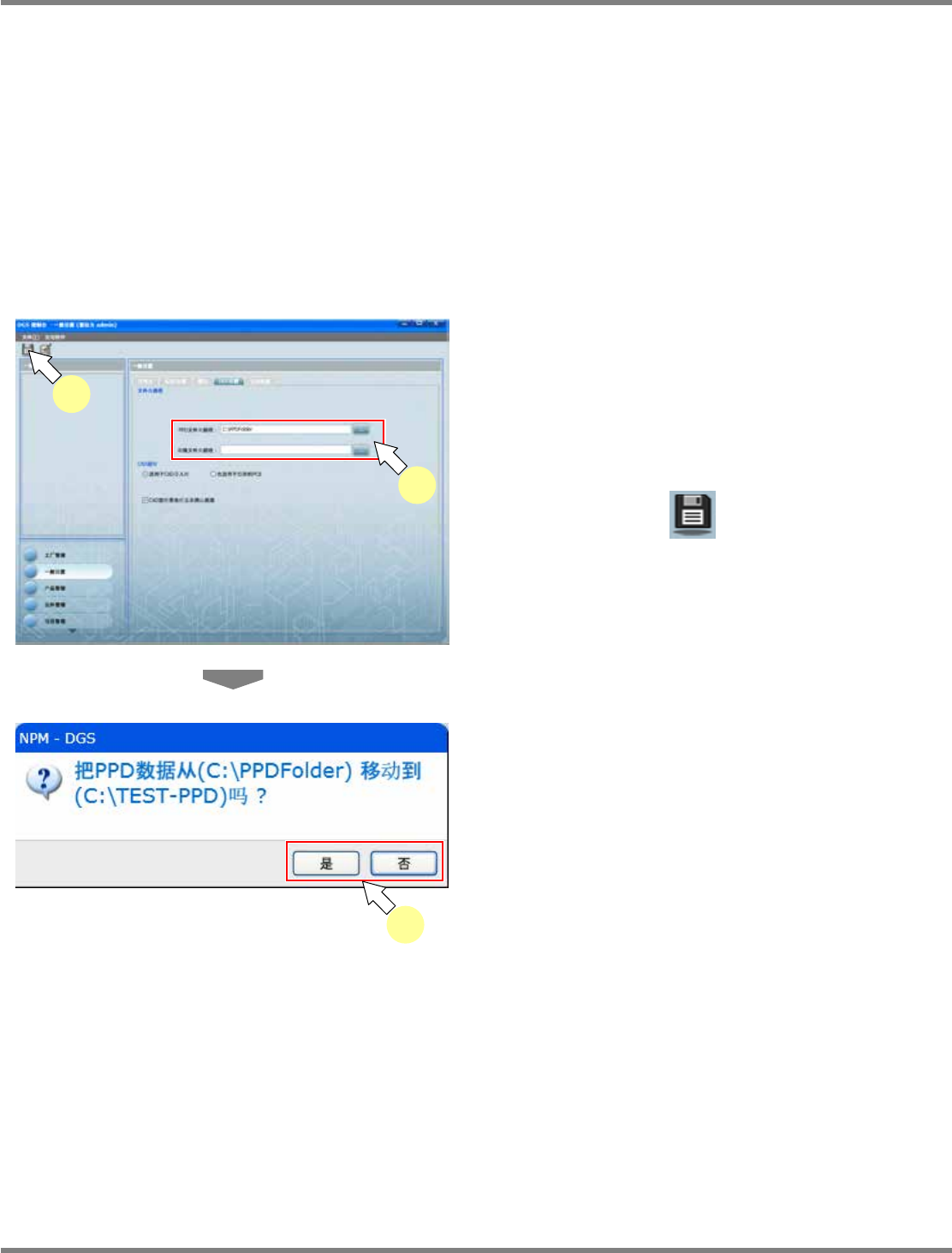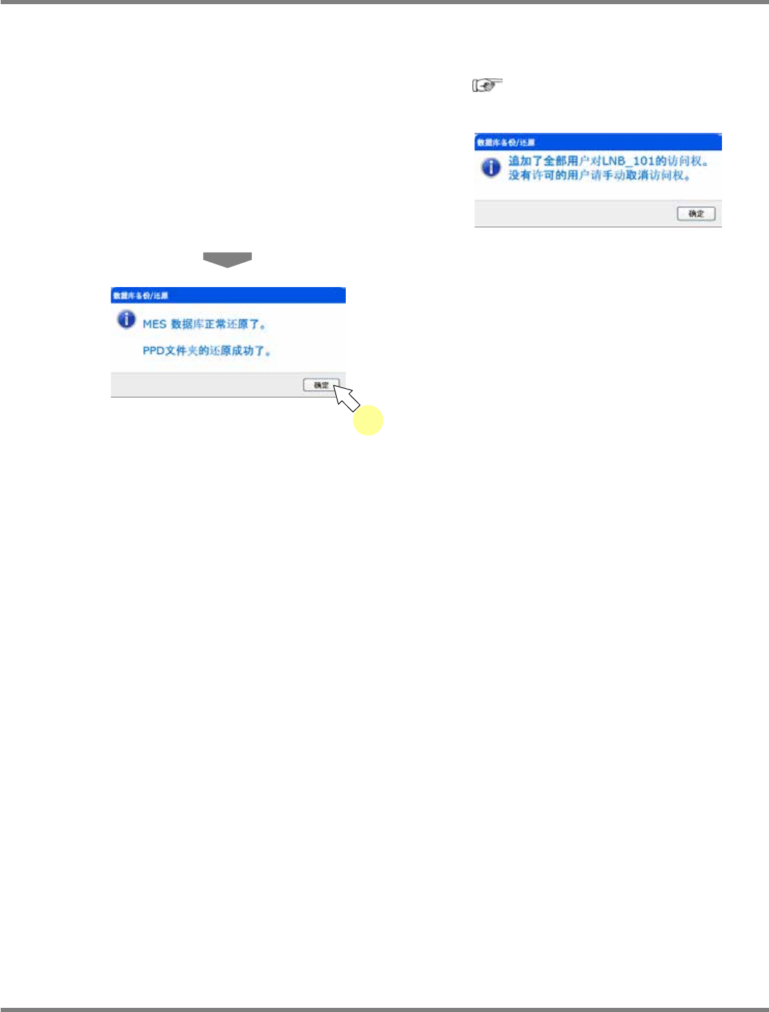 NPM-DGS 程序手册 3.2 关于环境设定画面 EJS9AC-MB-03P-04 Page 3-23 没有继续时,将会显示下述信息,并 针对在备 份所恢复的实际生产线而追加访问权 。生产线 的访问权设定,请参照下述记载。 ( ‘8.1.5 用户帐户的变更 ■可参照实际 生产线的变更 ’) 8 将显示还原完毕的对话框, 点击 [ 确定 ] 。 Environment03 0104S-12C01 8 Environment03 02…