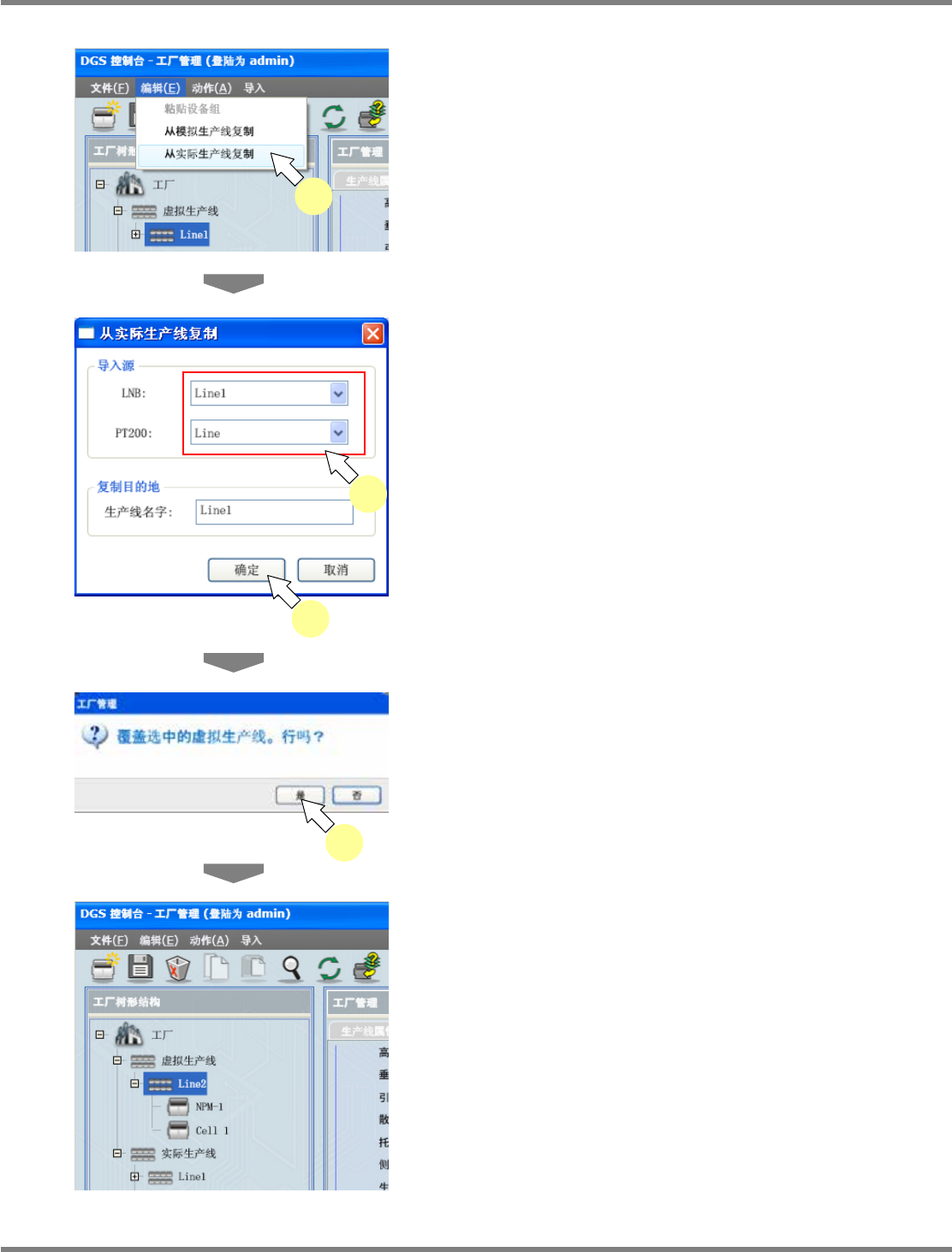 NPM-DGS 程序手册 4.3 假想生产线的构筑 EJS9AC-MB-04P-08 Page 4-7 4.3 假想生产线的构筑 4.3.1 假想生产线的设置 添加生产线 1 右击 ‘ 虚拟生产线 ’ ,选择 [ 在工厂最末端 添加新的生产线 ] , 或选择 ‘ 虚拟生产线 ’ , 然后点击工具栏的 ( 生产线追 加 ) 。 将会显示 < 输入生产线具体信息 > 画面。 2 输入生产线名字。 最多可输入 20 个…