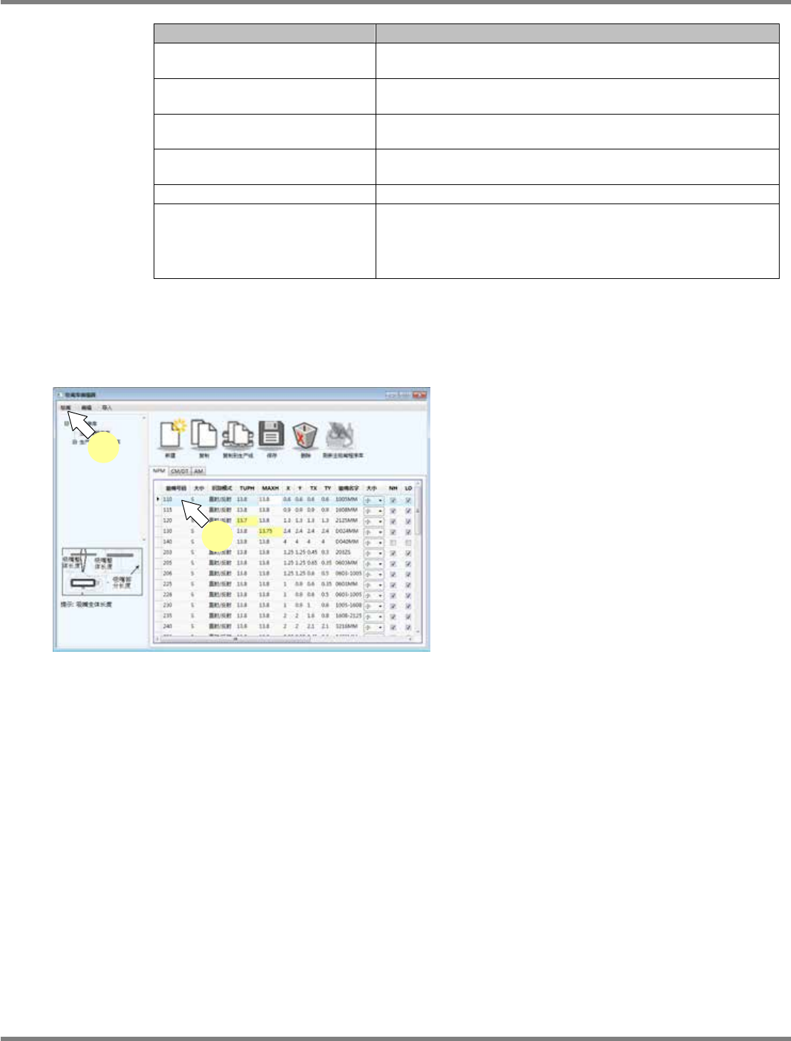 NPM-DGS 程序手册 4.4 吸嘴程序库编辑器 Page 4-56 EJS9AC-MB-04P-10 4.4.3 吸嘴数据 对吸嘴数据的详细内容进行说明。 吸嘴数据设定项目 (NPM 、 CM/DT 通用 ) 项目 说明 ‘ 吸嘴号码 ’ 吸嘴的编号。不能编辑标准吸嘴。 • 12 、 16 吸嘴用的小吸嘴 吸嘴编号的尾数显示 ‘S’ 。 ( 比如 :1100 → 1100S) • AM 用吸嘴 吸嘴编号的尾数显示 ’M’ 。 (…