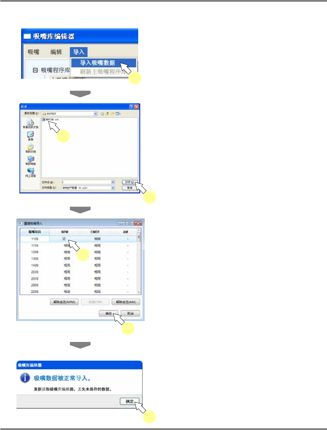 NPM-DGS 程序手册 4.4 吸嘴程序库编辑器 EJS9AC-MB-04P-08 Page 4-65 4 选择 ‘ 生产线 ’ 。 5 点击 [ 确定 ] 。 在生产线吸嘴程序库内复制的吸嘴将 会被追加 进其他生产线的吸嘴程序库。 6 选择菜单栏的 [ 吸嘴 ] [ 保存 ] 。 7 点击 [ 确定 ] 。 Factory040406S-1 2C00 7 Factory040406S-1 0C00 4 5 Factory04…