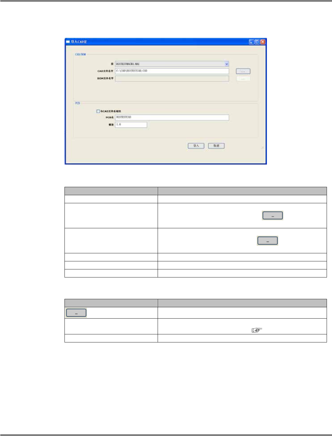 NPM-DGS 程序手册 5.2 CAD 宏的定义 EJS9AC-MB-05P-09 Page 5-67 4. 导入 打开导入标签,使用目前编辑中的宏 文件获取 CAD 和 BOM 文件。 设定项目 项目 说明 ‘ 宏 ’ 显示已定义的宏文件。 ‘CAD 文件名字 ’ 指定 CAD 文件的路径。在默认设定时, 已被指定用于宏定义的 样本文件。点击 ‘CAD 文件名字 ’ 旁边的 ,将会显示文件 选择画面。 ‘BOM 文件名字 ’ 指…