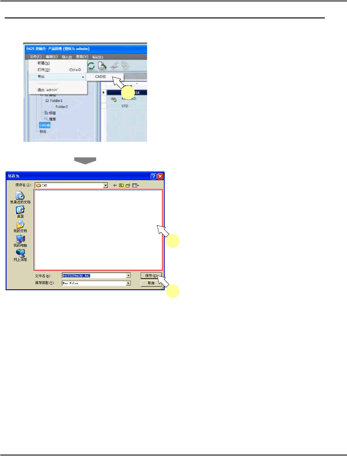 NPM-DGS 程序手册 5.5 CAD 宏的导出 Page 5-100 EJS9AC-MB-05P-09 5.5 CAD 宏的导出 进行 CAD 宏的导出,则会向文件里输 出 CAD 宏编辑器的 CAD 宏详细设定。 1 选择菜单栏的 [ 文件 ] [ 导出 ] [CAD 宏 ] 。 显示出 < 另存为 > 画面。 2 选择要导出的地点。 3 点击 [ 保存 ] 。 Project050500S-0 1C04 …