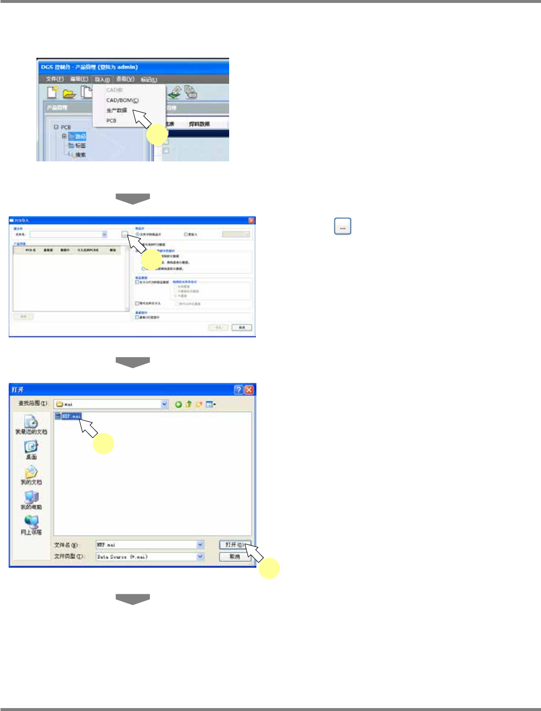 NPM-DGS 程序手册 5.6 生产数据的 PCB 导入 Page 5-106 EJS9AC-MB-05P-09 5.6.2 CM/DT 生产数据的导入 CM/DT 生产数据的导入 1 选择菜单栏的 [ 导入 ] [ 生产数据 ] 。 显示 <PCB 导入 > 画面。 2 点击 。 显示 < 打开 > 画面。 3 选择要导入的 CM/DT 生产数据。 不显示文件时,请将 ‘ 文件种类 ’ 变更为…
