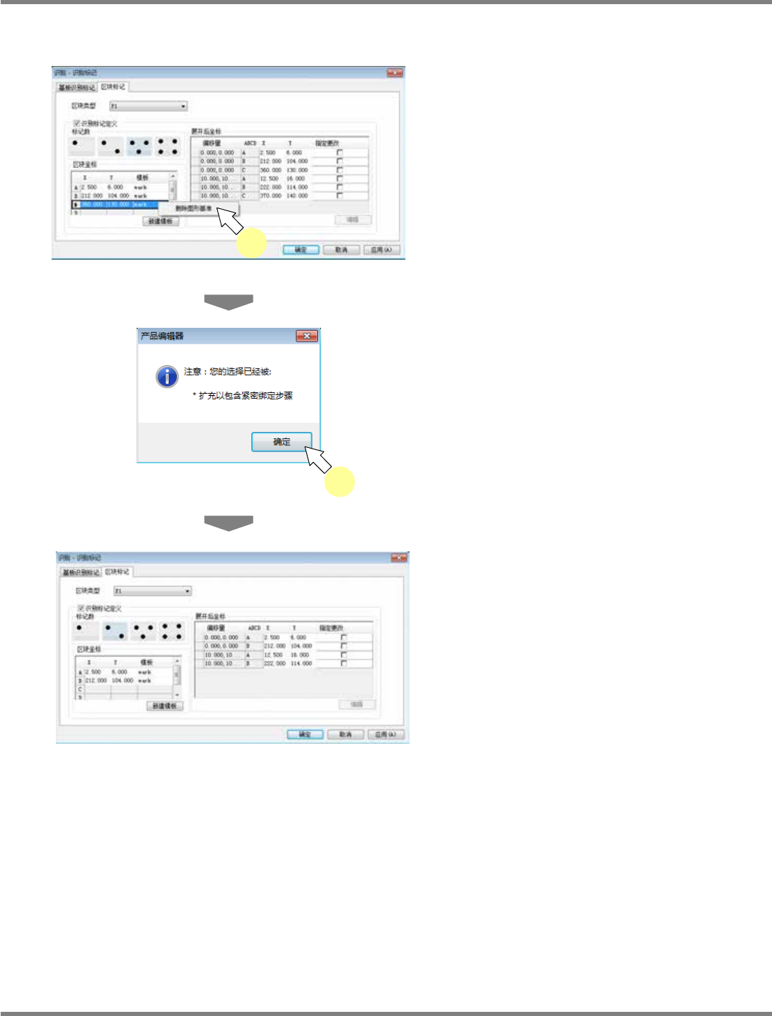 NPM-DGS 程序手册 5.8 PCB 编辑 EJS9AC-MB-05P-09 Page 5-175 ③ 图形基准的选择删除 1 选择想要删除的图形基准后, 点击右击 菜单的 [ 删除图形基准 ] 。 2 显示出确认对话框,点击 [ 是 ] 。 将删除所选择的图形基准,且基准数 会减少一 个。 需要将变更反映到 PCB 时, 请点击 [ 确定 ] 或 [ 应 用 ] 。 Project050802S-1 35C00 1 Pro…