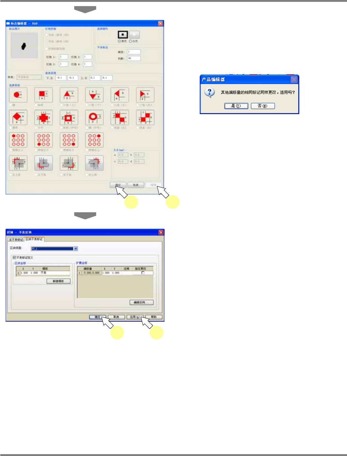 NPM-DGS 程序手册 5.8 PCB 编辑 EJS9AC-MB-05P-09 Page 5-189 ③ 图形不良标记的删除 1 选择菜单栏的 [ 识别 ] [ 不良标记 ] ,或 者双击图形不良标记。 显示出 < 识别 – 不良区块 > 画面。 2 选择 [ 区块不良标记 ] 标签。 双击图形不良标记, 自动显示出 [ 区块不良标记 ] 标签。 3 选择要删除图形不良标记的图形类型。 4 将 ‘ 不良标记定义…