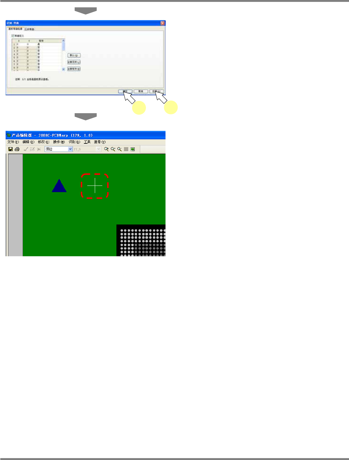 NPM-DGS 程序手册 5.8 PCB 编辑 EJS9AC-MB-05P-09 Page 5-197 ① 基板弯曲计测点的新建 1 选择菜单中的 [ 识别 ] [ 弯曲 ] 。 显示出 < 识别 – 弯曲 > 画面。 2 选择 [ 基板弯曲检查 ] 选项。 3 在 ‘ 弯曲定义 ’ 上打勾。 4 将未使用变更为使用。或者单击 [ 全部 有效 ] 按钮。 5 需要将弯曲计测点一次性都以默认方 式设定时,点击 [ 默认…