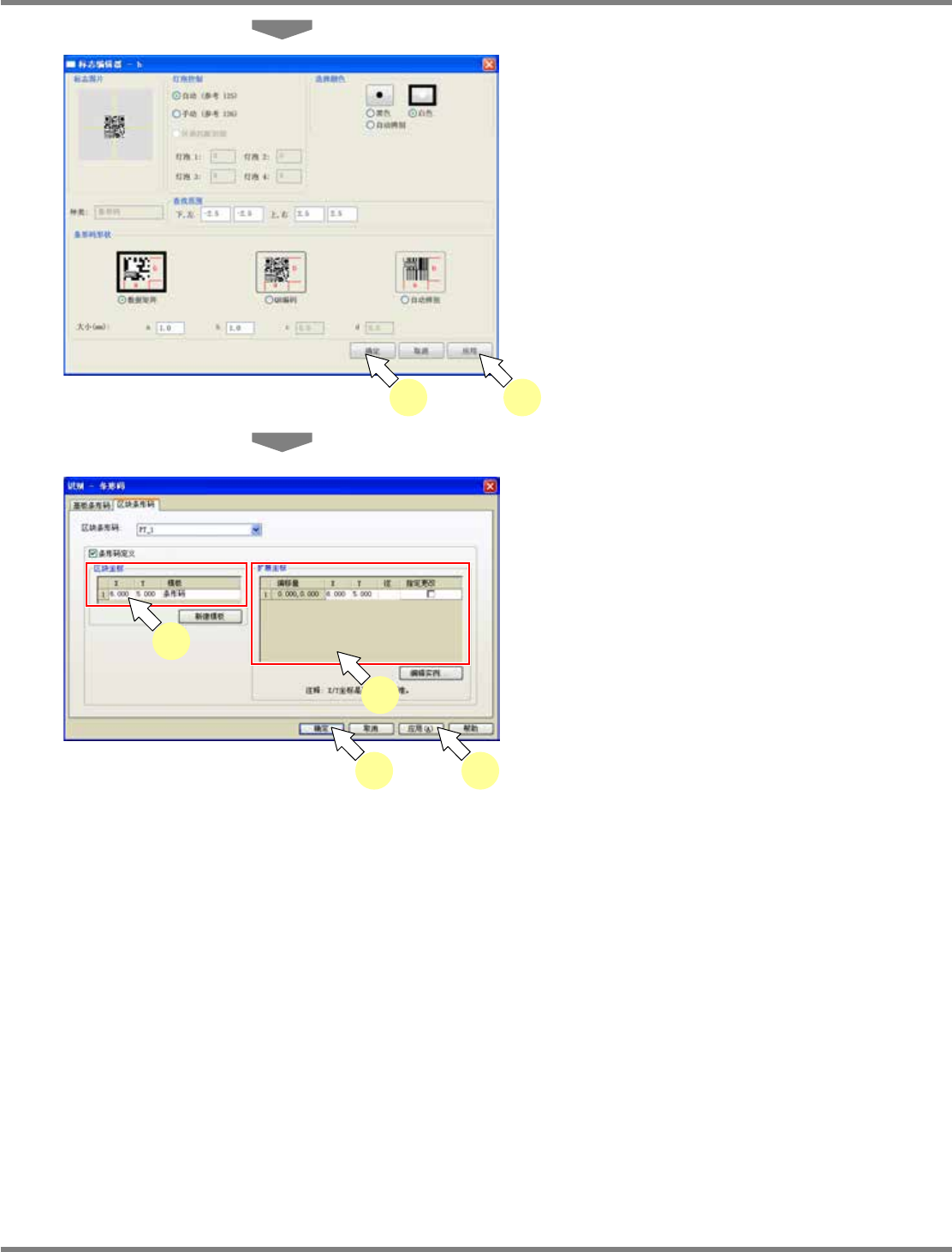 NPM-DGS 程序手册 5.8 PCB 编辑 Page 5-210 EJS9AC-MB-05P-09 ② 图形条形码的编辑 1 选择菜单栏的 [ 识别 ] [ 条形码 ] 。 显示出 < 识别 – 条形码 > 画面。 2 选择 [ 区块条形码 ] 标签。 3 选择要编辑图形条形码的图形类型。 4 若要变更图形条形码基准,进行变更。 5 选择要变更的图形条形码,进行变更。 6 进行标记编辑时,点击 [ 编辑实例 ] …