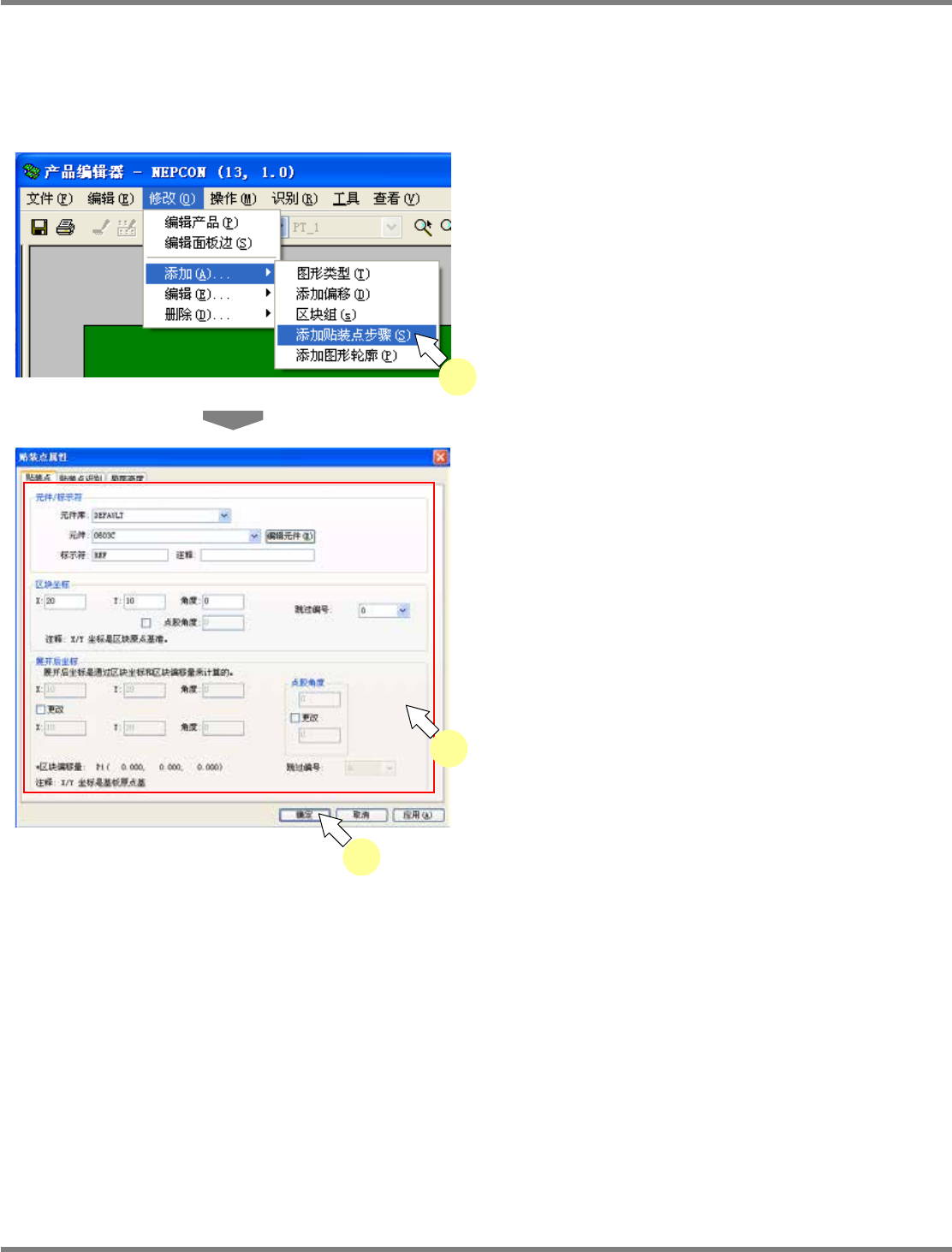 NPM-DGS 程序手册 5.8 PCB 编辑 EJS9AC-MB-05P-09 Page 5-227 PCB 文件信息的编辑 1 选择菜单栏的 [ 修改 ] [ 编辑产品 ] ,或 者鼠标光标位于基板上时在右击菜单 中选择 [ 编辑产品 ] 。 显示出 < 产品信息 > 画面。 2 在 ‘ 条形码 ’ 栏里输入值。 3 在 ‘ 注释 ’ 栏里输入注释。 4 点击 [ 确定 ] 。 PCB 文件信息设定项目 …