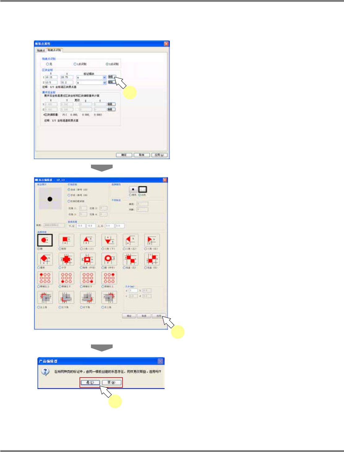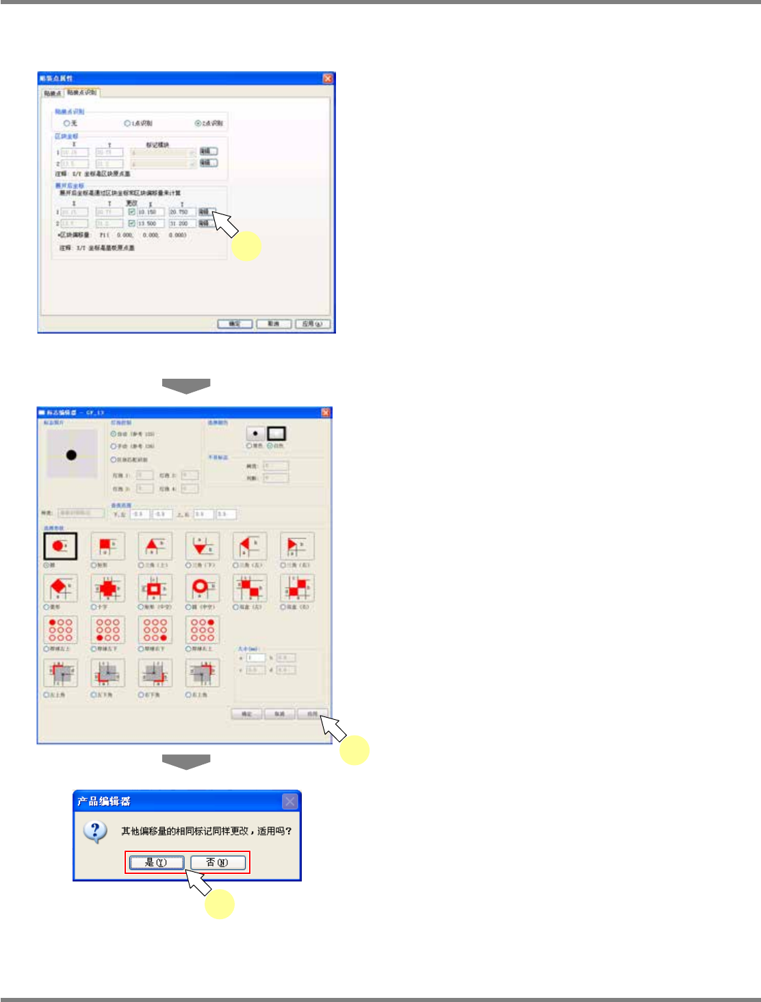 NPM-DGS 程序手册 5.8 PCB 编辑 Page 5-232 EJS9AC-MB-05P-09 当存在多个区块偏移量时 当基板拥有多个区块偏移量时,将在 编辑之际显示变更到其他偏移量 的确认对话框。 1 点击展开坐标上的 [ 编辑 ] 。 2 对需要进行编辑的部位执行所需的设 定后,点击 [ 应用 ] 。 如果这时在基板上存在多个区块偏移 量,将显 示确认对话框。 3 点击 [ 是 ] 或 [ 否 ] 。 [ 是 ] :…