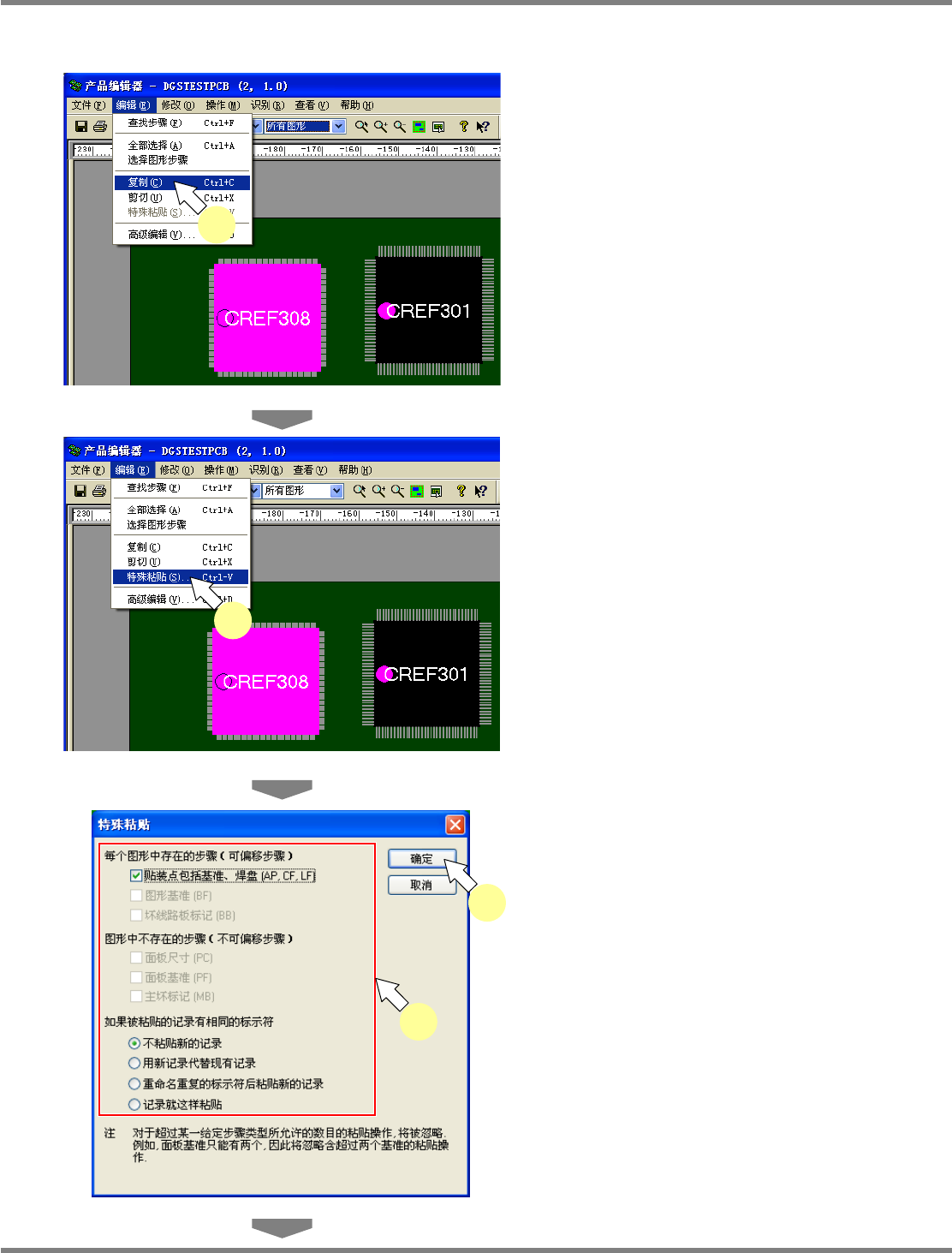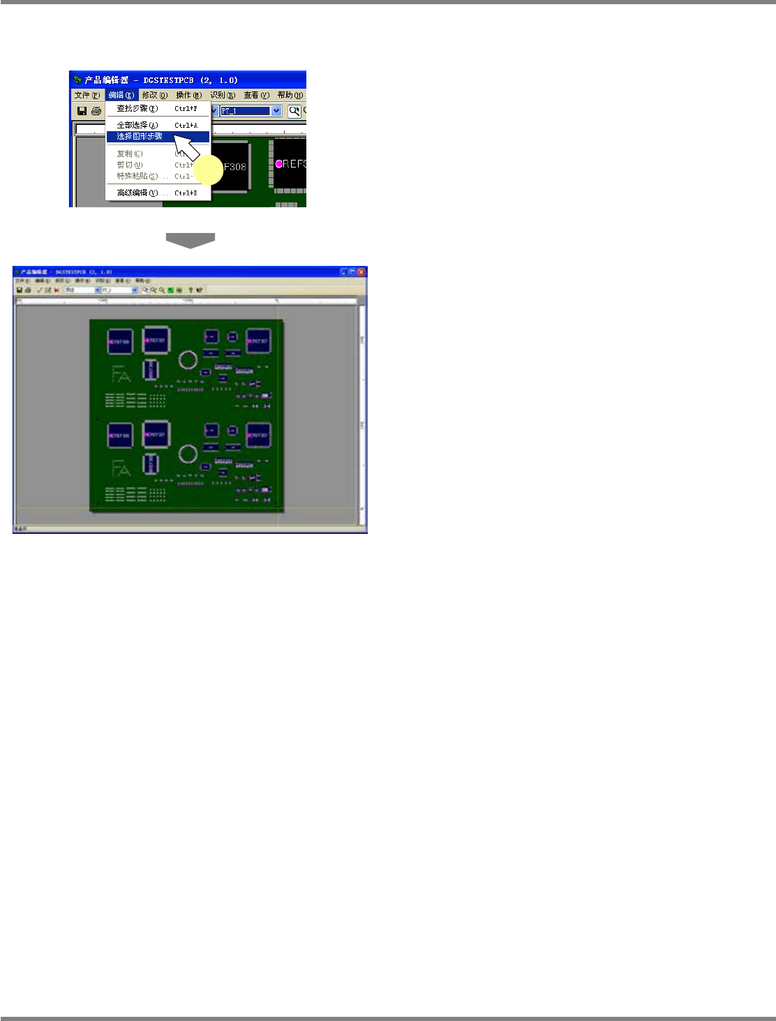 NPM-DGS 程序手册 5.8 PCB 编辑 Page 5-244 EJS9AC-MB-05P-09 图形位置的选择 1 选择菜单栏的 [ 编辑 ] [ 选择图形步 骤 ] ,或者在所选元件上弹出右击菜单, 选择 [ 选择图形类型的所有位置 ] 。 选择出所选图形类型的实装点、标记 。 Project050804S-1 8C00 1 Project050804S-1 9C00