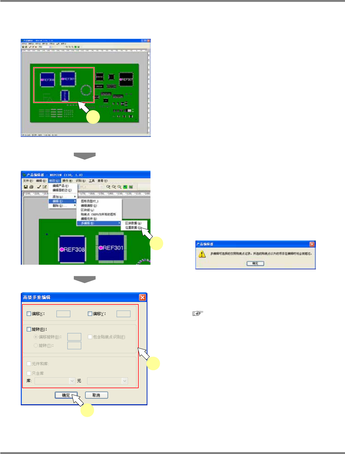 NPM-DGS 程序手册 5.8 PCB 编辑 Page 5-252 EJS9AC-MB-05P-09 多编辑 元件选择 当多个贴装点发生偏移时,可在基板 上通过选择进行整体编辑。 1 在基板上选择需要编辑的贴装点。 2 选择菜单栏的 [ 修改 ] [ 编辑 ] [ 多编 辑 ] [ 区块数据 / 位置数据 ] 。 显示出 < 详细编辑 > 画面与 < 高级多重编辑 > 画 面。 当选择了…