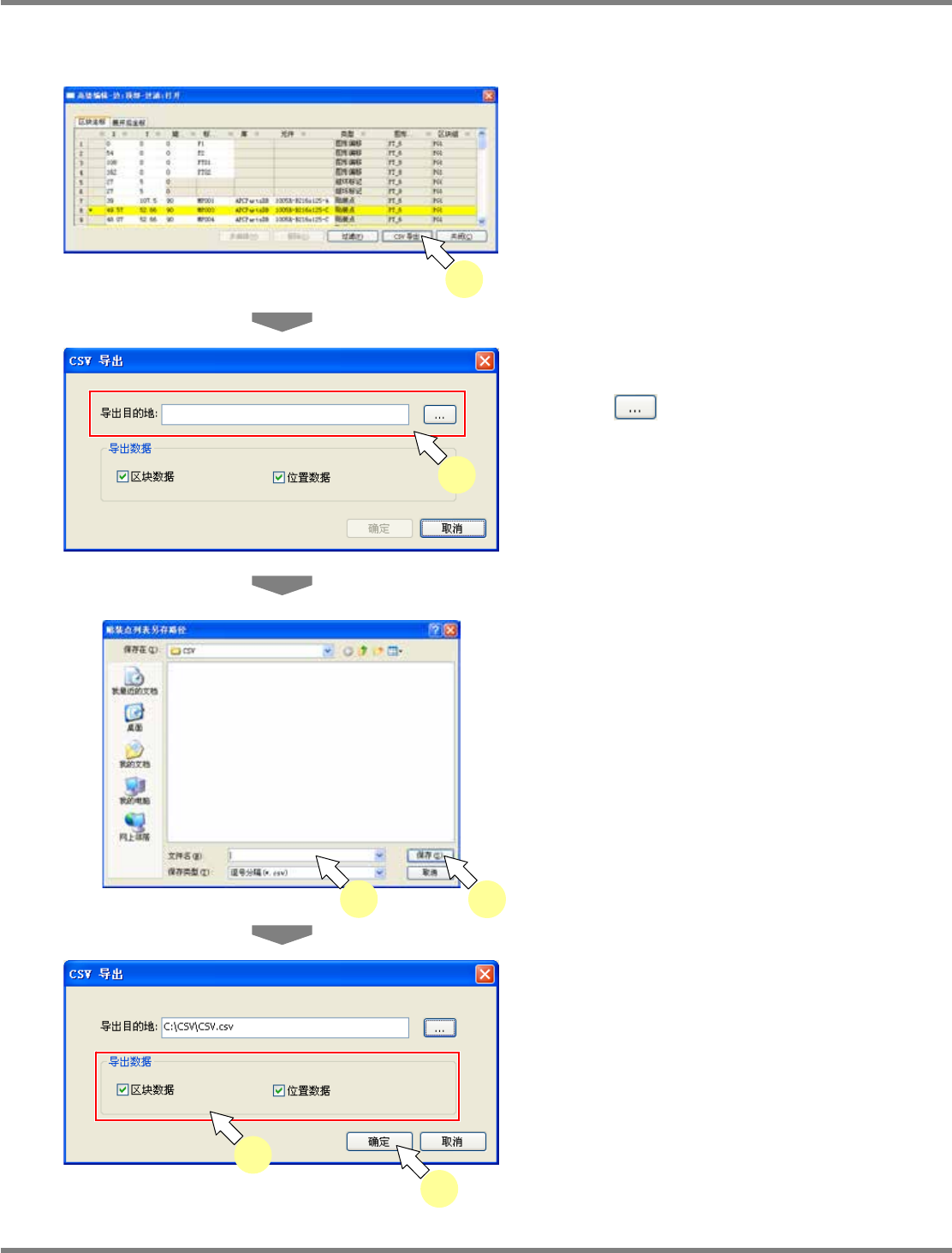NPM-DGS 程序手册 5.8 PCB 编辑 EJS9AC-MB-05P-09 Page 5-257 CSV 导出对话框 1 点击 [CSV 导出 ] 。 2 设定导出目的地。 点击 ,将显示 < 贴装点列表另存途径 > 画 面。 3 输入需要保存的文件后,点击 [ 保存 ] 。 将设定所输入的文件名。 4 选择输出数据。 ‘ 区块数据 ’: 以 CSV 形式输出区块坐标选项的信息。 ‘ 位置数据 ’: 以 C…