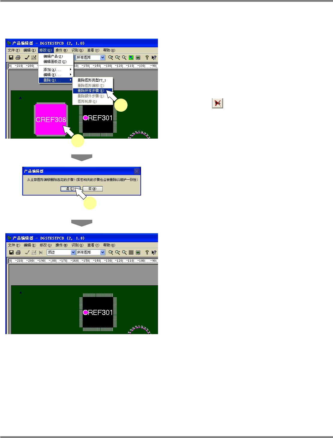 NPM-DGS 程序手册 5.8 PCB 编辑 Page 5-260 EJS9AC-MB-05P-09 5.8.5 实装点的删除 所选位置的删除 1 在 PCB 编辑器的 PCB 图像中选择要删 除的元件。 2 选择菜单栏的 [ 修改 ] [ 删除 ] [ 删除 所有步骤 ] , 或者在所选元件上弹出右击 菜单,选择 [ 实装点删除 ] ,或者选择工 具栏的 ( 位置的删除 ) 。 显示出确认对话框。 3 点击 [ 是 …