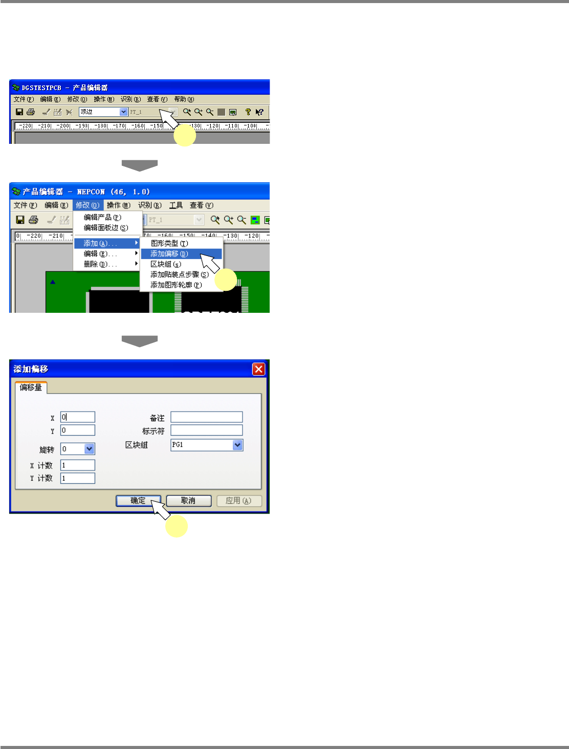 NPM-DGS 程序手册 5.8 PCB 编辑 EJS9AC-MB-05P-09 Page 5-265 5.8.7 图形偏移量 图形偏移量表面画面 在图形偏移量画面上设定各图形的偏 移量信息。 偏移量是记述将基本图形装配在基板 时的位置和角度。 设定项目 项目 说明 ‘ 图形类型 ’ 选择要变更的图形类型。 ‘ 图形 ’ 向登录的图形偏移分配单值的号码。 ‘X’ 显示图形的 X 坐标。 ‘Y’ 显示图形的 Y 坐标。 ‘ 旋转 …
