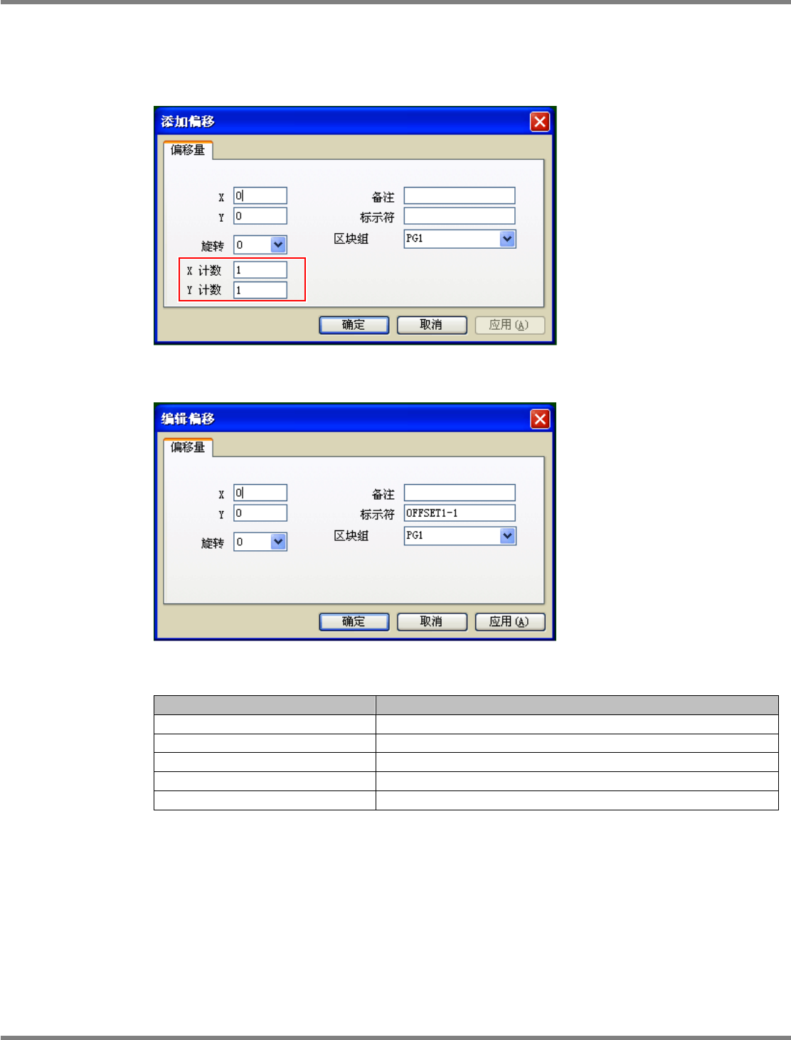 NPM-DGS 程序手册 5.8 PCB 编辑 Page 5-272 EJS9AC-MB-05P-09 仅在添加时显示出来的设定项目 ( 用框框住的部分 ) 项目 说明 ‘X 计数 ’ 将多个偏移量同时添加到 X 方向时,设定本字段。 输入添加到 X 方向的图形数量。 ‘Y 计数 ’ 将多个偏移量同时添加到 Y 方向时,设定本字段。 输入添加到 Y 方向的图形数量。 ‘X 间距 ’ 将多个偏移量同时添加到 X 方向时,设定本字段。 …