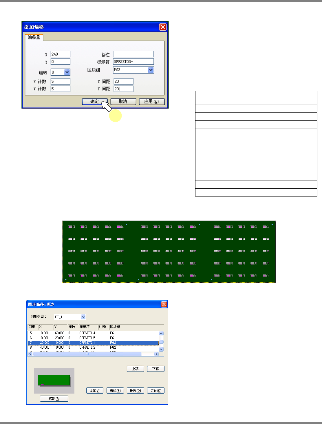 NPM-DGS 程序手册 5.8 PCB 编辑 Page 5-280 EJS9AC-MB-05P-09 4. 按照图形组的数目反复进行 3. 的操作 设定第 2 组的图形偏移量 1 选择菜单栏的 [ 修改 ] [ 添加 ] [ 图形 偏移 ] 。 显示出 < 添加偏移 > 画面。 2 输入如下所示的偏移量数据, 然后点击 [ 确定 ] 。 ‘X’ 120 ‘Y’ 0 ‘ 旋转 ’ 0 ‘X 计数 ’ 5 ‘Y…