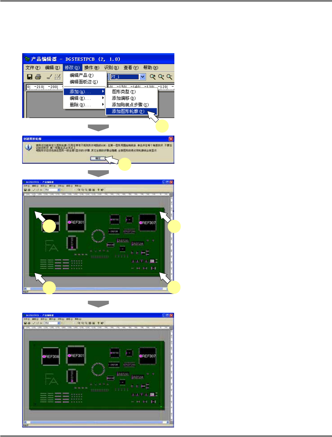 NPM-DGS 程序手册 5.8 PCB 编辑 EJS9AC-MB-05P-09 Page 5-287 5.8.9 电路外形 通过电路外形的添加,则可用线条描 画 V 型槽切割基板等印刷基板的外形。 电路外形的添加 1 选择菜单栏的 [ 修改 ] [ 添加 ] [ 添加 图形轮廓 ] 。 显示出 < 创建图形轮廓 > 画面。 2 点击 [ 确定 ] 。 关闭 < 创建图形轮廓 > 画面。 3 …