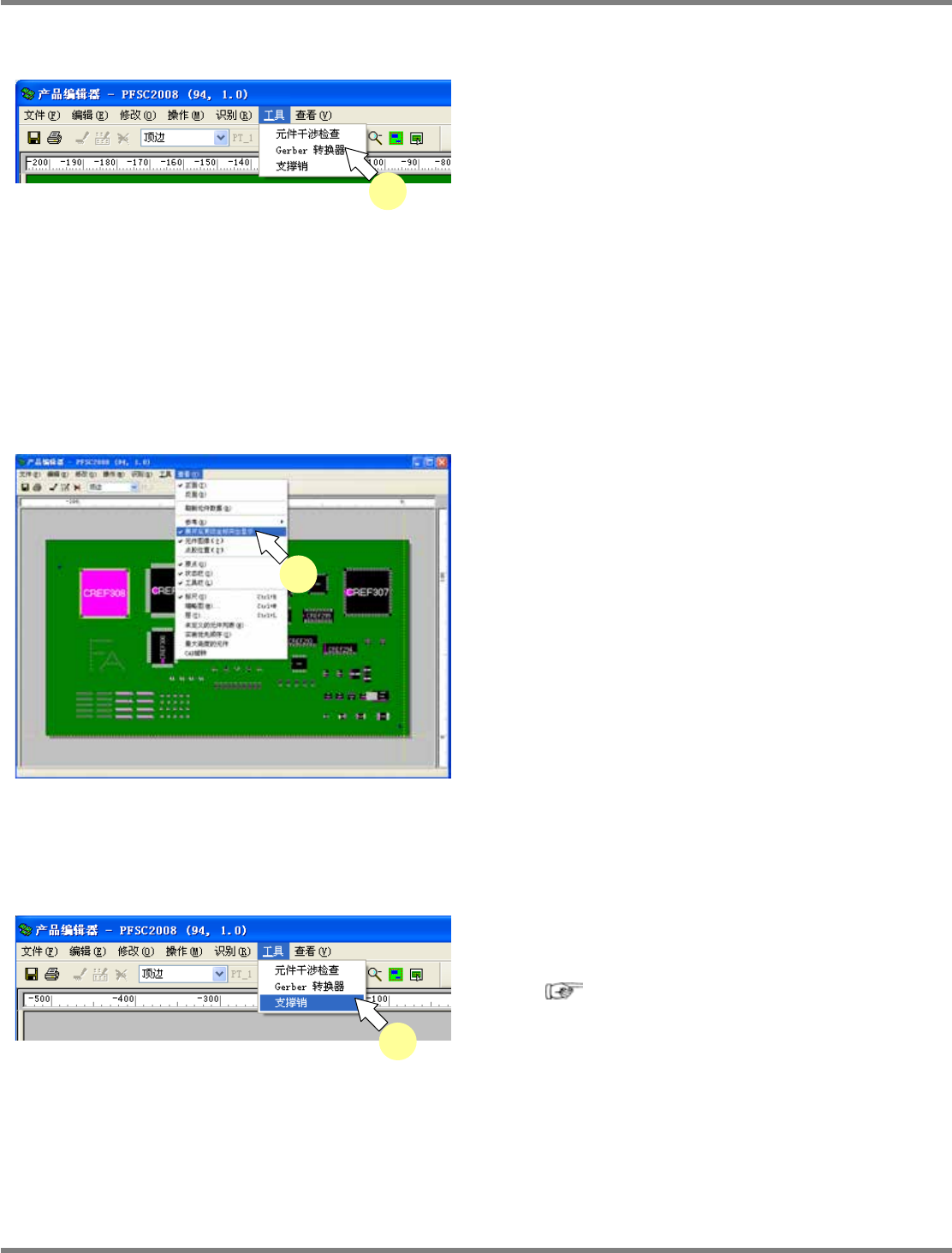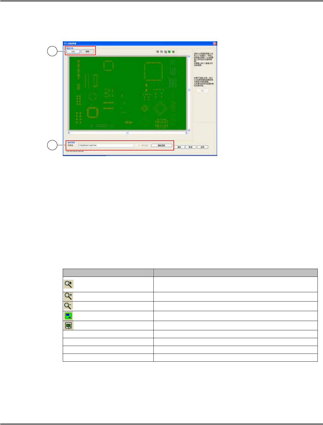 NPM-DGS 程序手册 5.8 PCB 编辑 EJS9AC-MB-05P-09 Page 5-319 5.8.16 导入基板图像 导入基板图像 在设定计测点或贴装点时,可作为参 考而显示导入后的实际基板图像 。 ① ‘ 画面切换 ’ 切换显示画面。 [DGS] : 将画面显示切换到 DGS 的显示。 [ 基板 ] : 将画面显示切换到基板图像。 ② ‘ 基板图像 ’ 显示读取基板图像的设定。 ‘ 文件名 ’ : 显示在 [ ・・・…