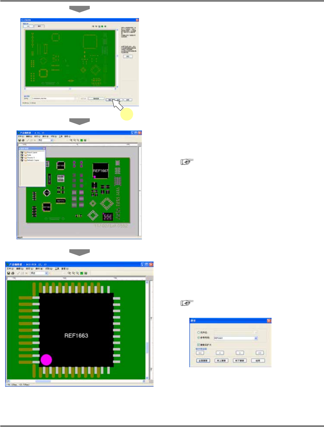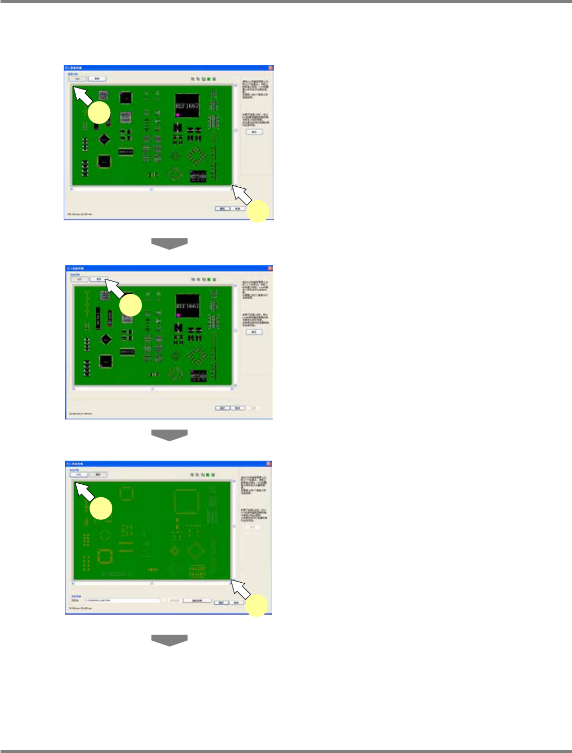 NPM-DGS 程序手册 5.8 PCB 编辑 EJS9AC-MB-05P-09 Page 5-323 ③ 在 PCB 编辑器上显示基板图像 导入基板图像后, DGS 画面的基板与基板图像的角将重叠显示 。 在 < 导入基板图像 > 画面下,通过设定基准点,可对基 板图像的显示进行调整。 1 点击基板上的两个角。 将在点击过的部位上显示 + 标记。 2 点击 ‘ 画面切换 ’ 的 [ 基板 ] 。 3 点击基板图像上的两…
