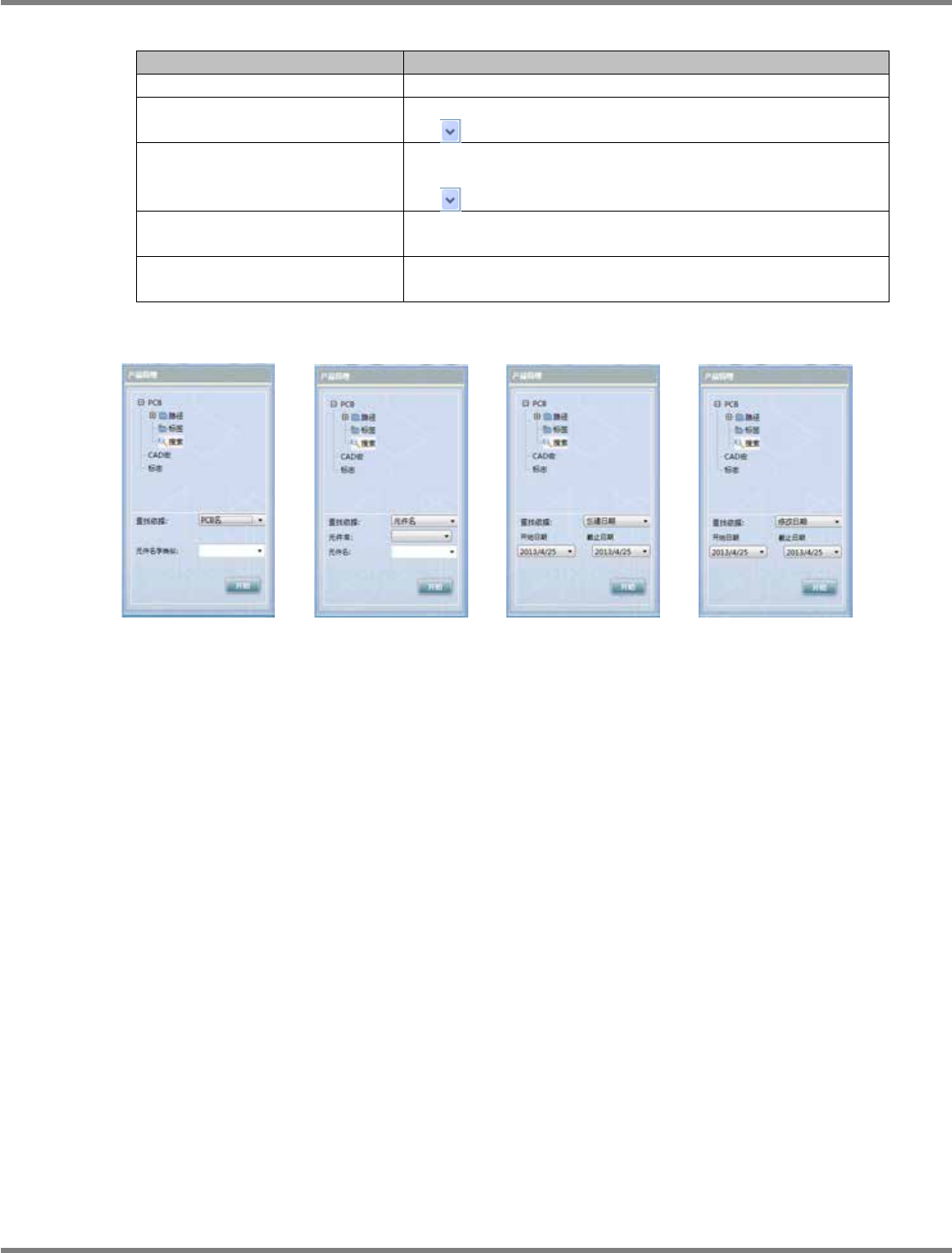 NPM-DGS 程序手册 5.9 PCB 搜索 Page 5-334 EJS9AC-MB-05P-09 搜索方法 项目 说明 [ 所有 ] 显示所有被登录的 PCB 。 [PCB 名 ] 输入部分 PCB 名。显示 PCB 名中包含所输入字符的 PCB 。 点击 ,即能够从搜索履历执行输入。 [ 部件号码 ] 输入元件库和元件名。显示包含所输 入的元件库和元件名的 PCB 。 点击 ,即能够从搜索履历执行输入。 [ 创建日期 ] 选…