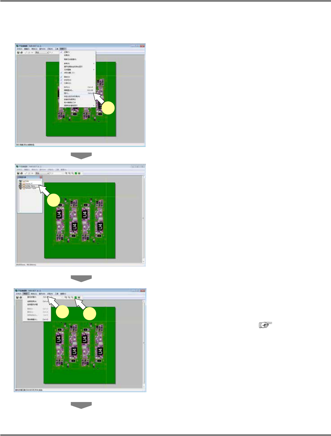NPM-DGS 程序手册 5.9 PCB 搜索 Page 5-340 EJS9AC-MB-05P-09 5.9.3 利用层次确认贴装位置与角度 通过合用层次于显示功能,可进行导 入 PCB 的确认,以及 PCB 数据的贴装位置与角度的确认。 在这里以利用焊料数据层次为例对方 法进行说明。 1 选择菜单栏的 [ 查看 ] [ 层 ] 。 显示出 < 正面层列表 > 画面。 2 在 < 正面层列表 > 画面上…