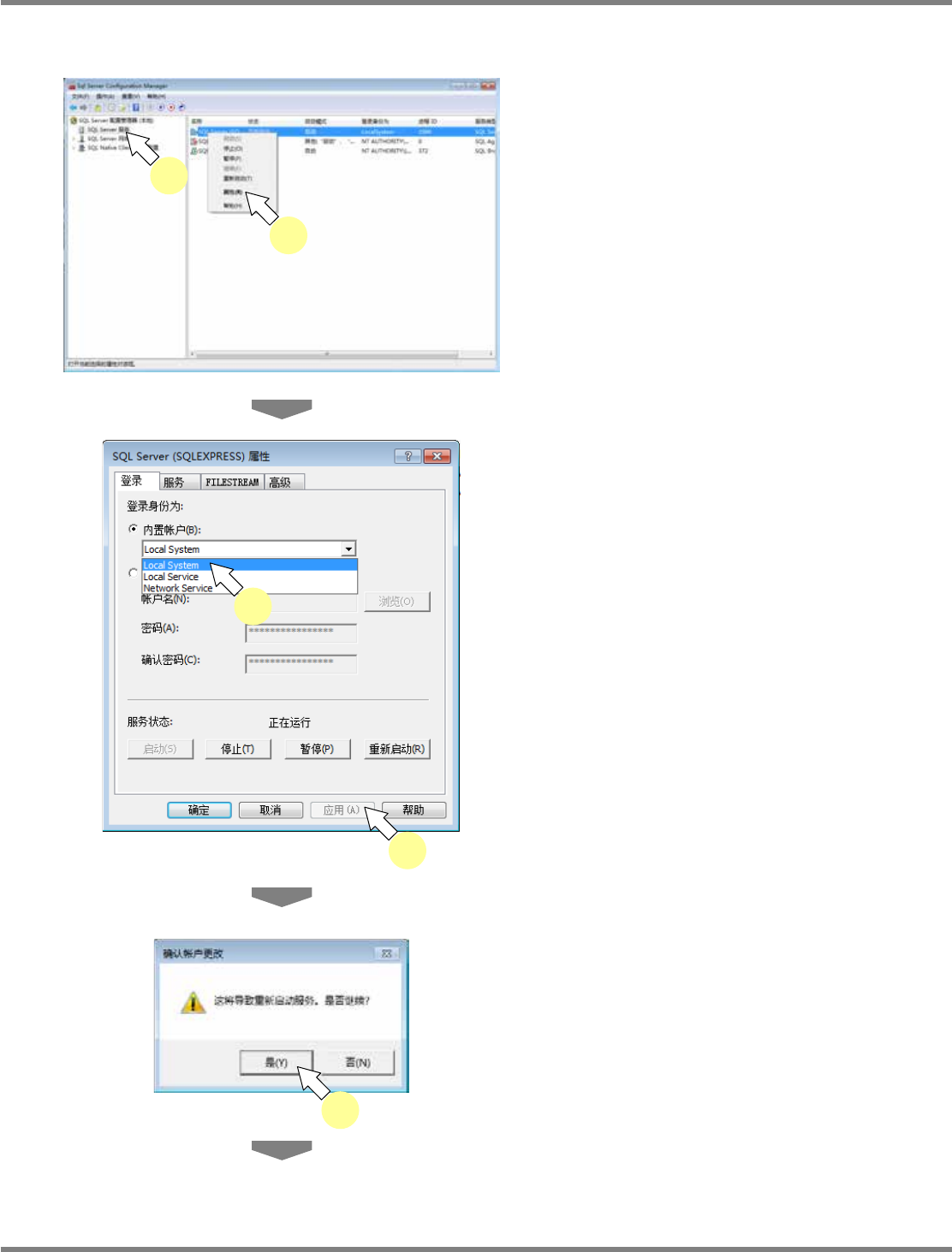 NPM-DGS 程序手册 2.1 NPM-DGS 的安装 EJS9AC-MB-02P-03 Page 2-17 ⑤ SQL Server (SQLEXPRESS) 的登录设定的变更 1 选择 ‘SQL Server 服务 ’ 。 2 在 ‘SQL Server (SQLEXPRESS)’ 上右 击,然后点击 [ 属性 ] 。 3 将 [ 内置帐户 ] 选项的 ‘ 组合帐户 ’ 变更至 ‘Local System’ 。 4 点击 [ 应用…