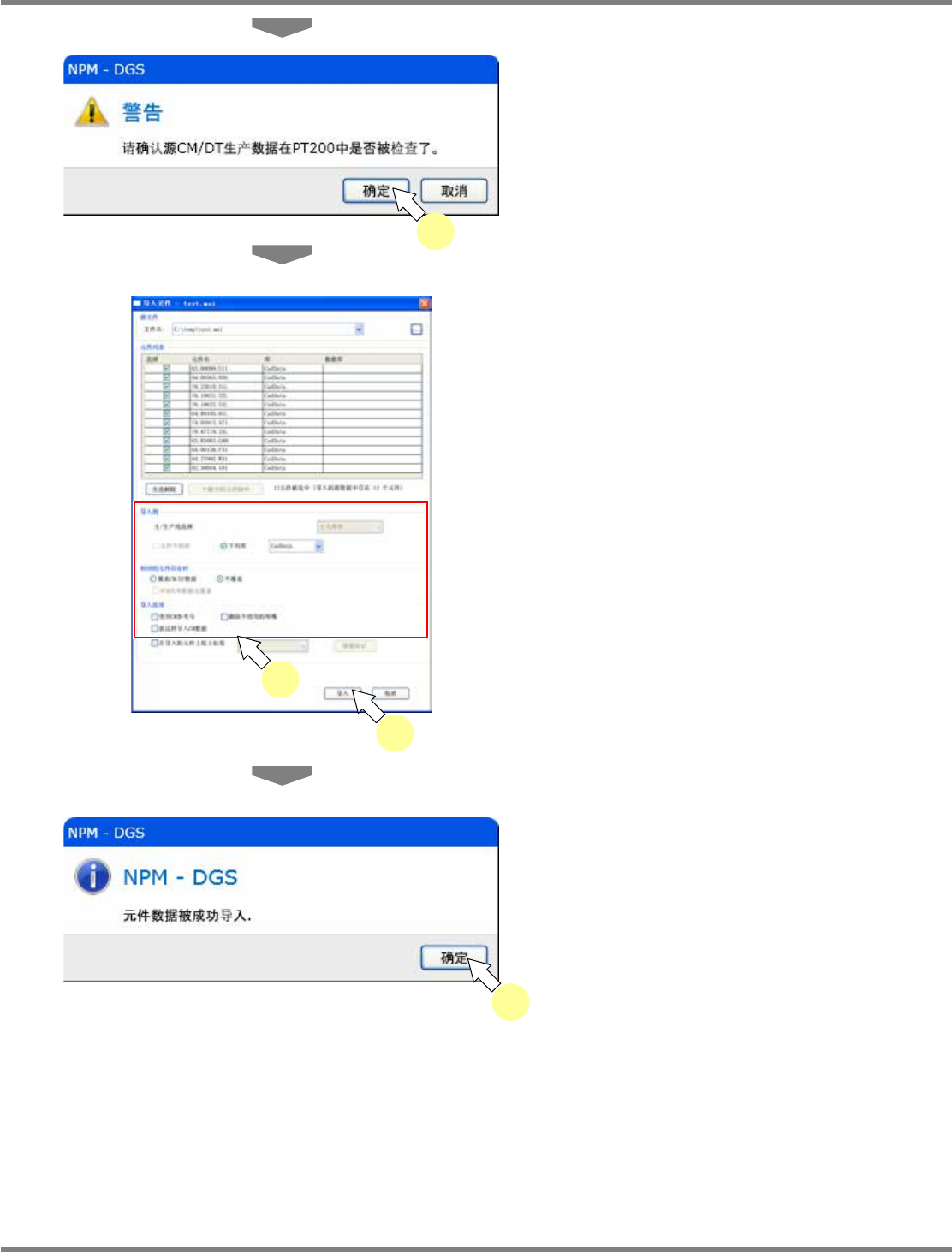 NPM-DGS 程序手册 6.4 元件的导入、导出 EJS9AC-MB-06P-08 Page 6-27 5 请确认源文件在 PT200 中是否进行数 据检查后,单击 [ 确定 ] 。 因为源文件不正常就不能被正确导入 ,请务必 在 PT200 中进行数据检查。 6 选择导入地点。 属于 CM/DT 生产数据时, 导入目的地只为所指 定的主元件库。请从 ' 下列库 ' 中选择主元件库。 若要在导入的元件上…