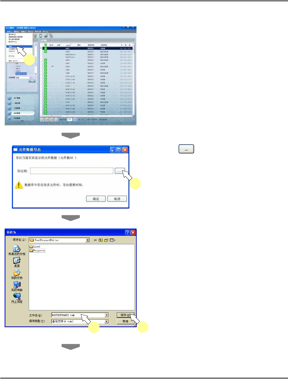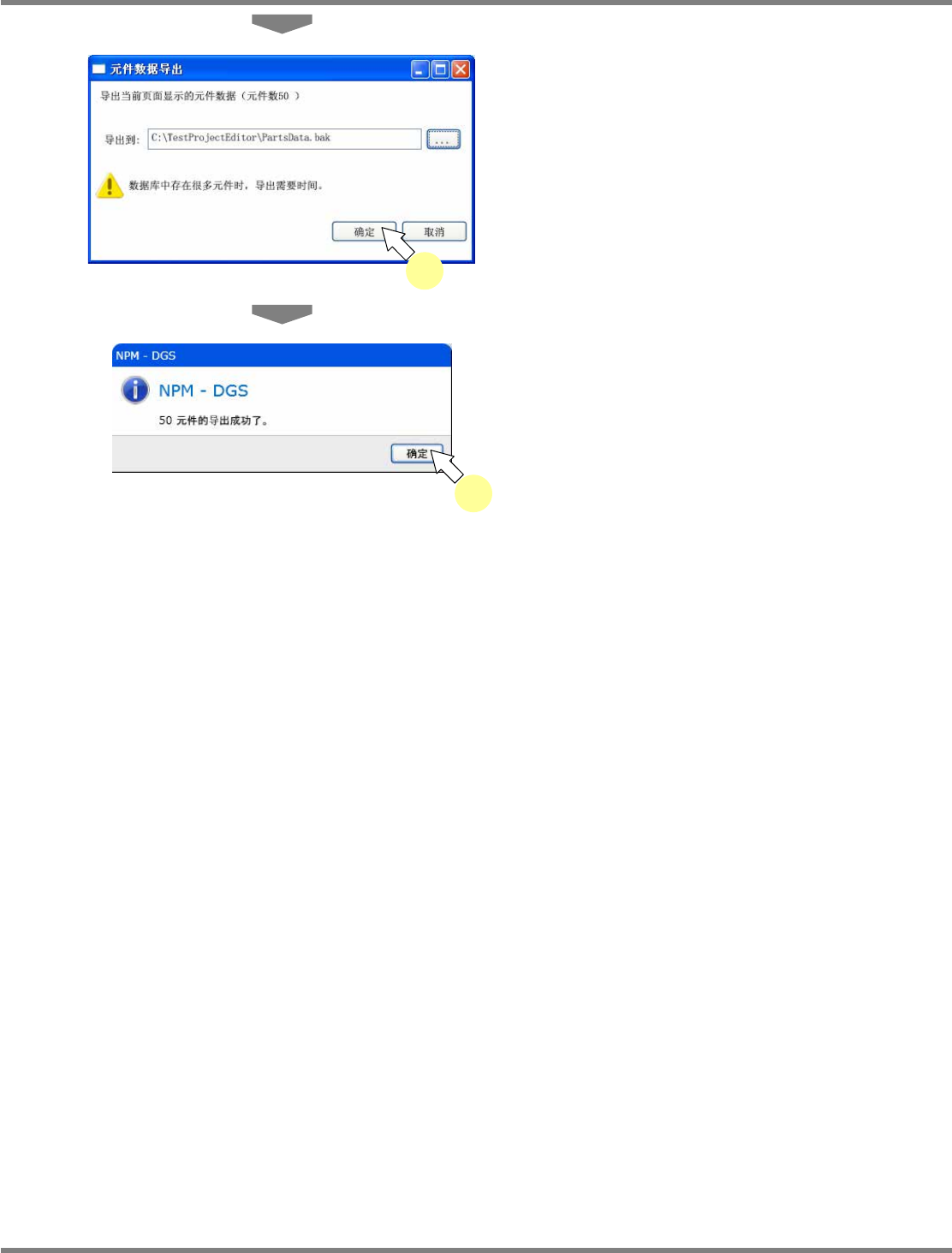 NPM-DGS 程序手册 6.4 元件的导入、导出 Page 6-36 EJS9AC-MB-06P-08 元件数据的导出 ( 为显示在当前页面上的元件数据时 ) 1 点击菜单栏的 [ 文件 ] [ 导出 ] 。 显示出文件名选择画面。 当元件数量多、有多个页面时,将只 导出显示 中的纪录。请显示出需要导出的页面 后再执行 导出。 2 点击 。 显示出 < 另存为 > 画面。 3 输入要保存的文件,点击 […