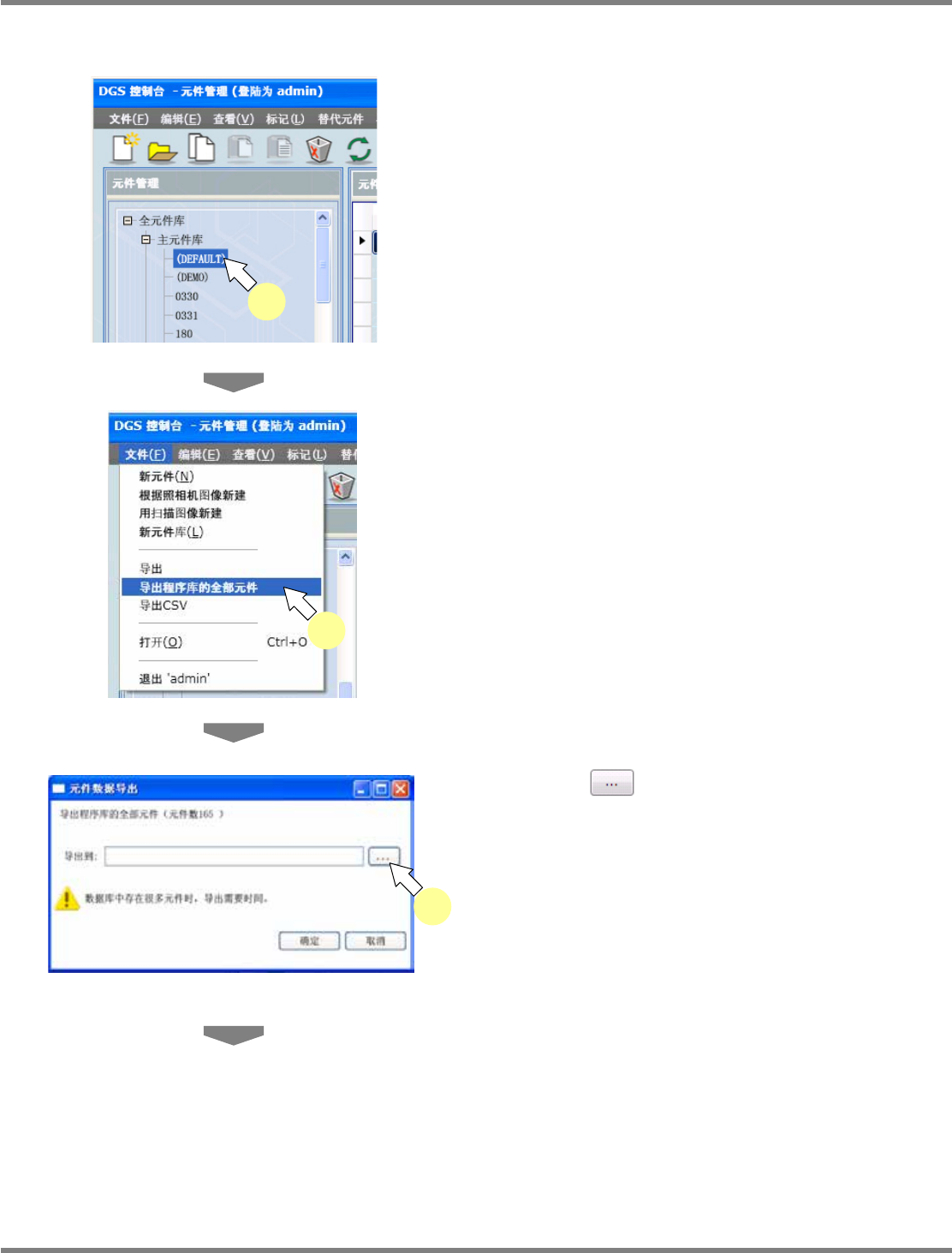 NPM-DGS 程序手册 6.4 元件的导入、导出 Page 6-38 EJS9AC-MB-06P-08 元件数据的导出 ( 选择元件库的全部元件数据时 ) 1 选择需要导出的主元件库 / 生产线元 件库。 导出元件库的全部元件时,无需变更 纪录数。 2 点击菜单栏的 [ 文件 ] [ 导出程序库的 全部元件 ] 。 显示出 < 元件数据导出 > 画面。 3 点击 。 显示出 < 另存为 > …