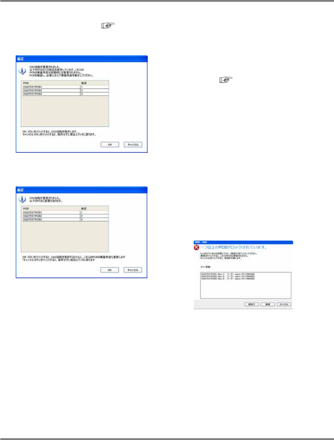 NPM-DGS 程序手册 6.5 添加新的元件 Page 6-86 EJS9AC-MB-06P-08 CAD 旋转变更时的确认对话框 在环境设定的 DGS 设定下, 当勾选了 ‘CAD 旋转变更时显示确认画面 ’ 时, 将显示下述画面。 关于 DGS 设定,请参照 ‘3.2.3 DGS 设定 ■关于 CAD 旋转 ’ 。 ① 当设定了 ‘PCB 导入时适用 ’ 时 将以一览方式显示使用变更后元件 的 PCB 。变 更虽然会反映到…