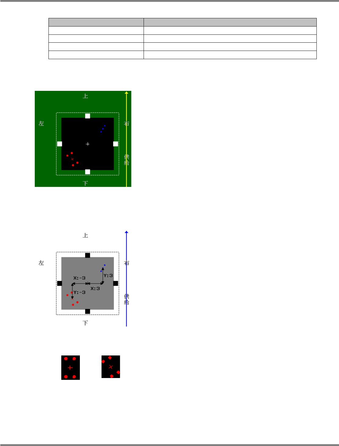 NPM-DGS 程序手册 6.5 添加新的元件 Page 6-98 EJS9AC-MB-06P-08 多点点胶数据设定项目 项目 说明 ‘ 描绘编码 ’ 是进行描画的顺序。 ‘X 坐标 ’ 以元件中心作为 0 时的描画 X 坐标。 ‘Y 坐标 ’ 以元件中心作为 0 时的描画 Y 坐标。 ‘ 角度 ’ 设定描画角度。 坐标、角度意象图 坐标、角度意象图示例 贴装前 点胶吸嘴形状 : 4 点 点胶类型 : 贴装前 ( 红色 ) X…