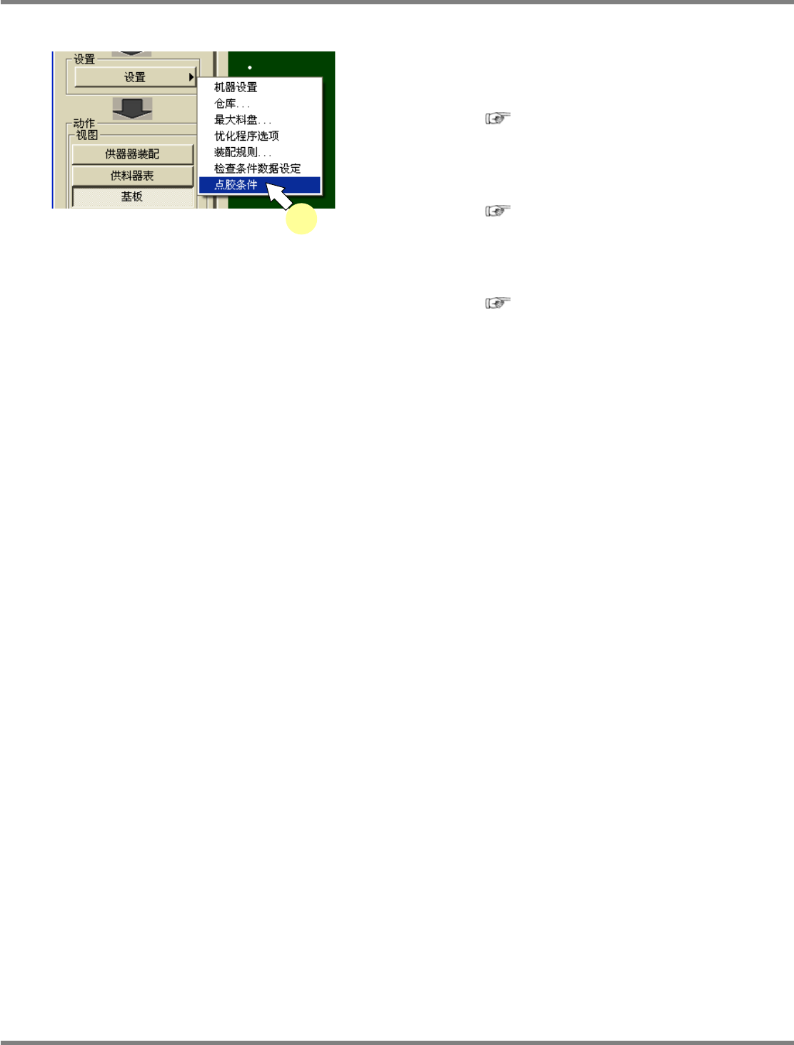 NPM-DGS 程序手册 6.5 添加新的元件 Page 6-102 EJS9AC-MB-06P-08 4. 点胶条件的设定 1 从项目栏的 ‘ 设置 ’ 中选择 [ 点胶条件 ] , 或 者选择菜单栏的 [ 编辑 ] [ 点胶条件 ] 。 请参阅 ‘7.11.7 点胶选项数据 ’ , 进行设定。 2 实施最佳化。 请参阅 ‘7.12.1 优化 ’ ,实施最优化。 3 实施生产数据的输出。 请参阅 ‘7.12.3 生成配…