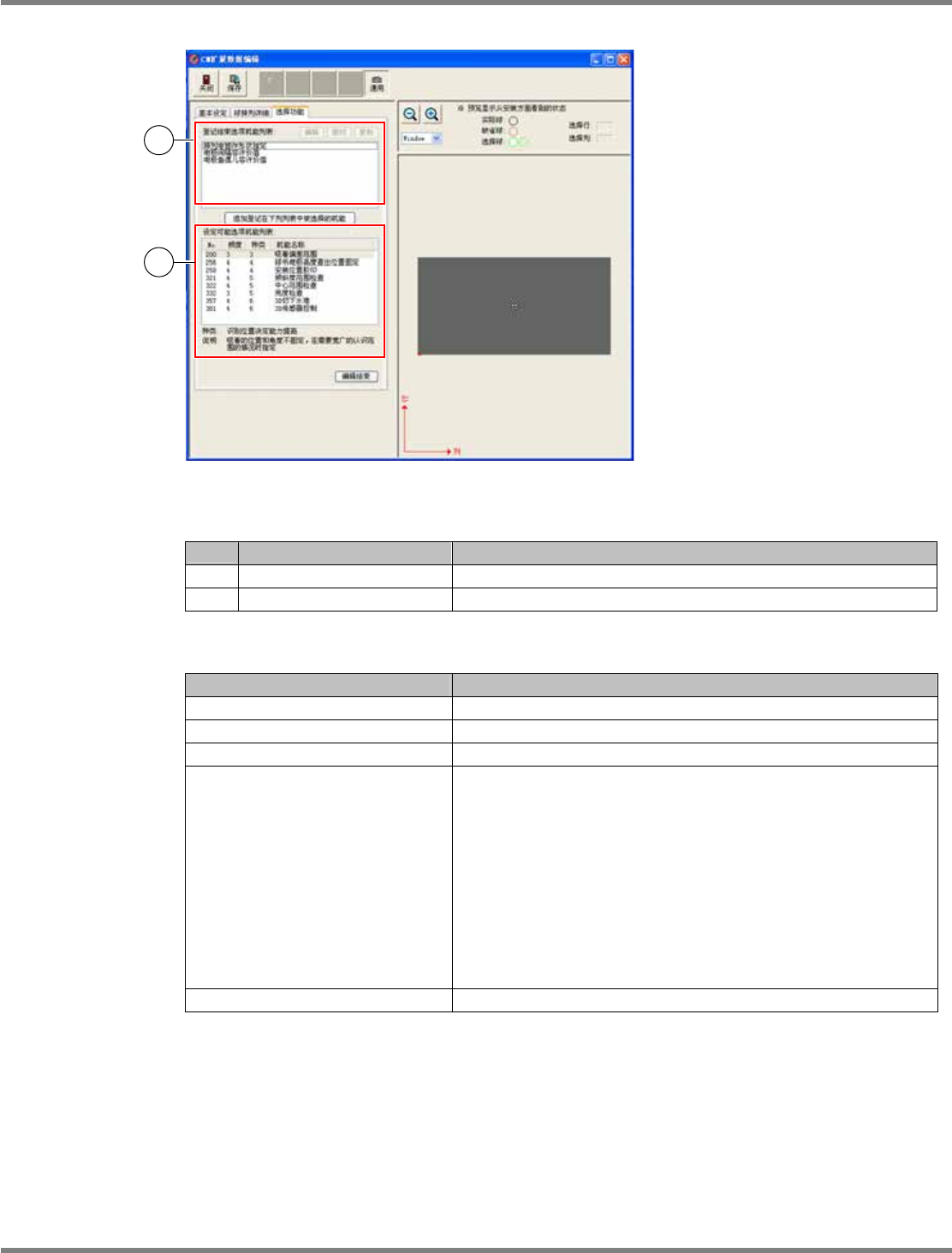 NPM-DGS 程序手册 6.5 添加新的元件 EJS9AC-MB-06P-08 Page 6-117 按下 [ 选项功能列表参照、设定 ] 时的画面 设定项目 No. 名称 说明 1 ‘ 登记结束选择机能列表 ’ 一览显示在其他标签设定的选项,以 及追加登录的选项功能。 2 ‘ 设定可能选项机能列表 ’ 一览显示可设定的选项。 按钮 按钮 说明 [ 编辑 ] 编辑所选择的登录完毕选项的设定值 。 [ 删除 ] 删除所选择的…