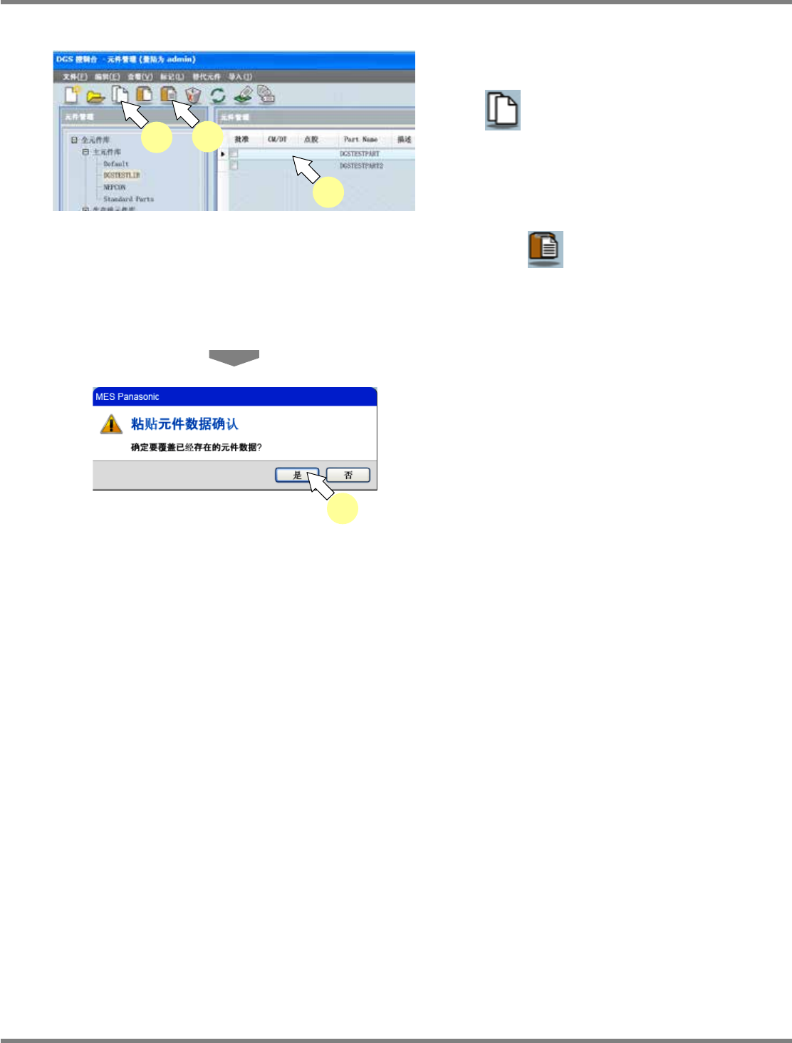 NPM-DGS 程序手册 6.6 复制元件 Page 6-124 EJS9AC-MB-06P-08 6.6.3 检查数据复制 1 选择需要复制的元件后, 再选择菜单栏 的 [ 编辑 ] [ 检查数据复制 ] ,或者从需 要复制的元件右击菜单上选择 [ 检查数 据复制 ] 。 2 选择复制处元件后,再选择菜单栏的 [ 编辑 ] [ 检查数据粘贴 ] ,或者从右击 菜单上选择 [ 检查数据粘贴 ] 。 显示出粘贴检查数据的确认画…