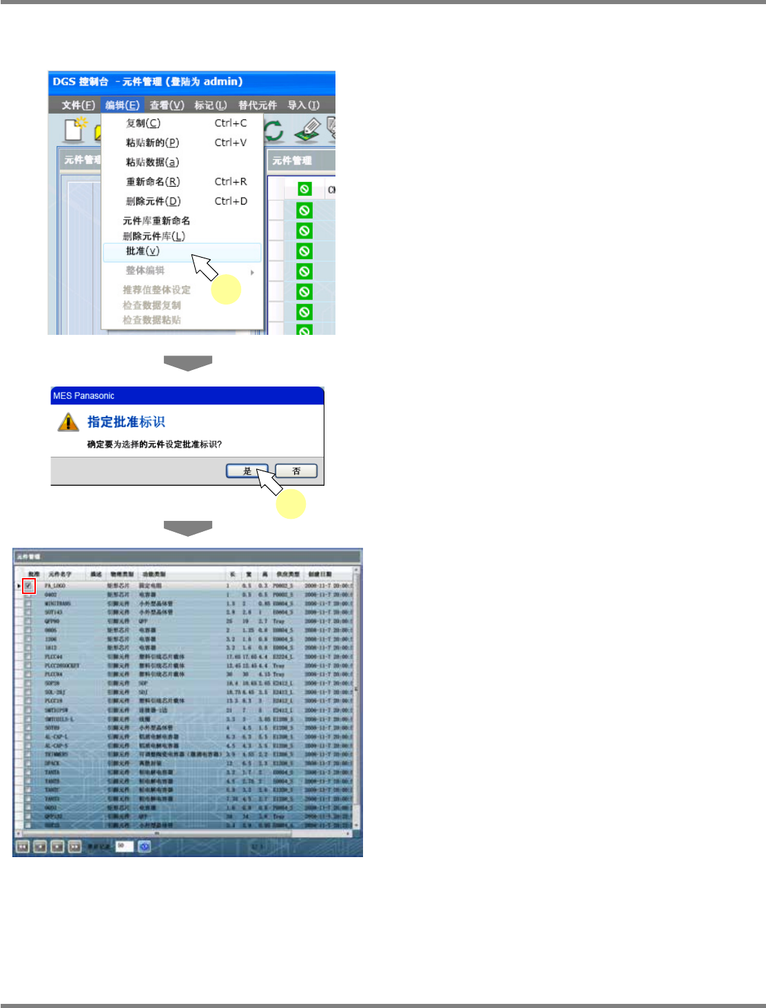 NPM-DGS 程序手册 6.7 现有元件的编辑 EJS9AC-MB-06P-08 Page 6-127 元件的删除 1 在元件一览表中选择要删除的元件。 2 选择菜单栏的 [ 编辑 ] [ 删除元件 ] ,或 者点击工具栏的 ( 删除元件 ) ,或 者在所选元件上弹出右击菜单, 选择 [ 删 除 ] 。 显示出删除元件的确认画面。 3 点击 [ 是 ] 。 在元件一览表中选择的元件将被删除 。 Parts060800S…
