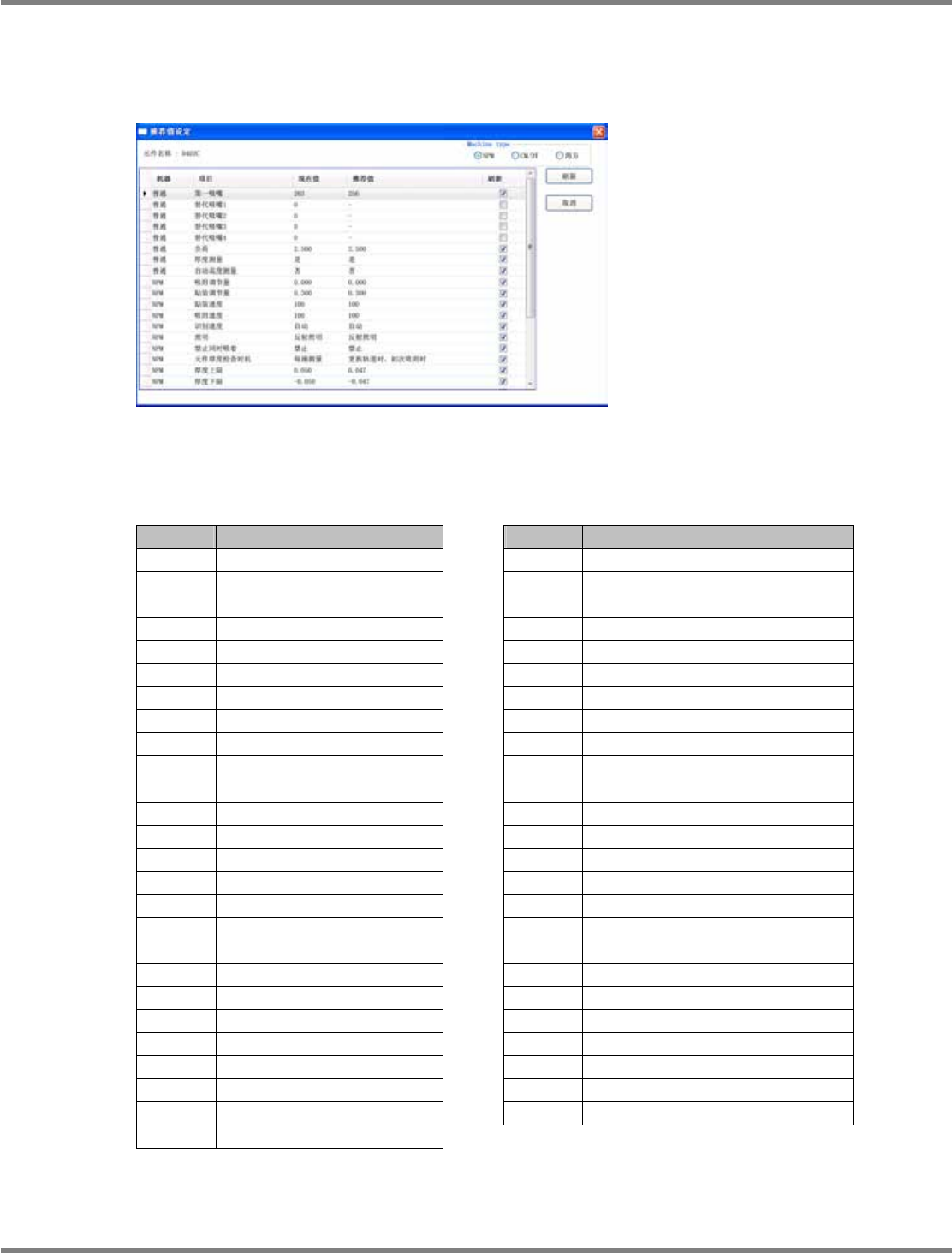 NPM-DGS 程序手册 6.7 现有元件的编辑 Page 6-134 EJS9AC-MB-06P-08 推荐值设定画面 推荐值的设定,因机种与元件种类的 不同,已分别自动设定。 选择了 [ 推荐值整体设定 ] 时,不会显示推荐值设定画面。 设定项目 各个选择 ‘NPM’ 、 ‘CM/DT ’ 后按下 [ 刷新 ] ,即会显示如下所示的设定项目。 机种 : NPM 机种 : CM/DT 机器 项目 机器 项目 普通 第一吸嘴…