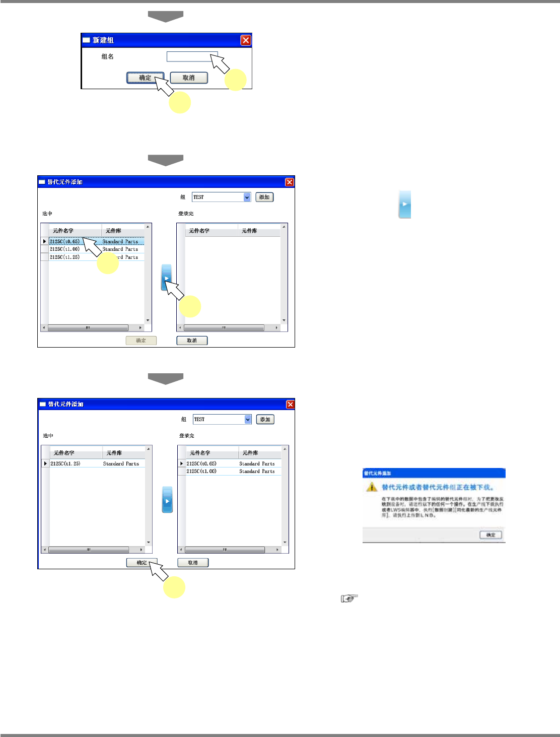 NPM-DGS 程序手册 6.8 代替元件的设定 EJS9AC-MB-06P-08 Page 6-147 3 输入组名称。 不能使用下列半角字符。 ¥ / : ? “ < > | ~ 4 点击 [ 确定 ] 。 将会关闭 < 新建组 > 画面。 5 选择作为代替元件组进行设定的元件, 然后点击 。 所选择的元件将会从 ‘ 选中 ’ 移动至 ‘ 登录完 ’ 。 6 点击 [ 确定 ] 。 当在下…