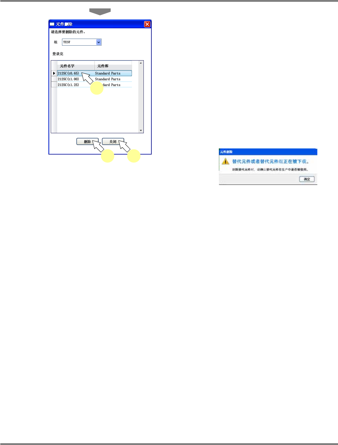 NPM-DGS 程序手册 6.8 代替元件的设定 Page 6-152 EJS9AC-MB-06P-08 在元件编辑器画面上删除设定 1 点击代替元件按钮 , 或者点击菜 单的 [ 高级 ] [ 替代元件 ] 。 显示出 < 元件删除 > 画面。 2 点击 [ 是 ] 。 当在下载数据中使用删除了替代元件 的组时, 将显示以下对话框。 ( 只在已下载完毕的生产线 元件上显示。 ) 当删除了组内的全部替代元…