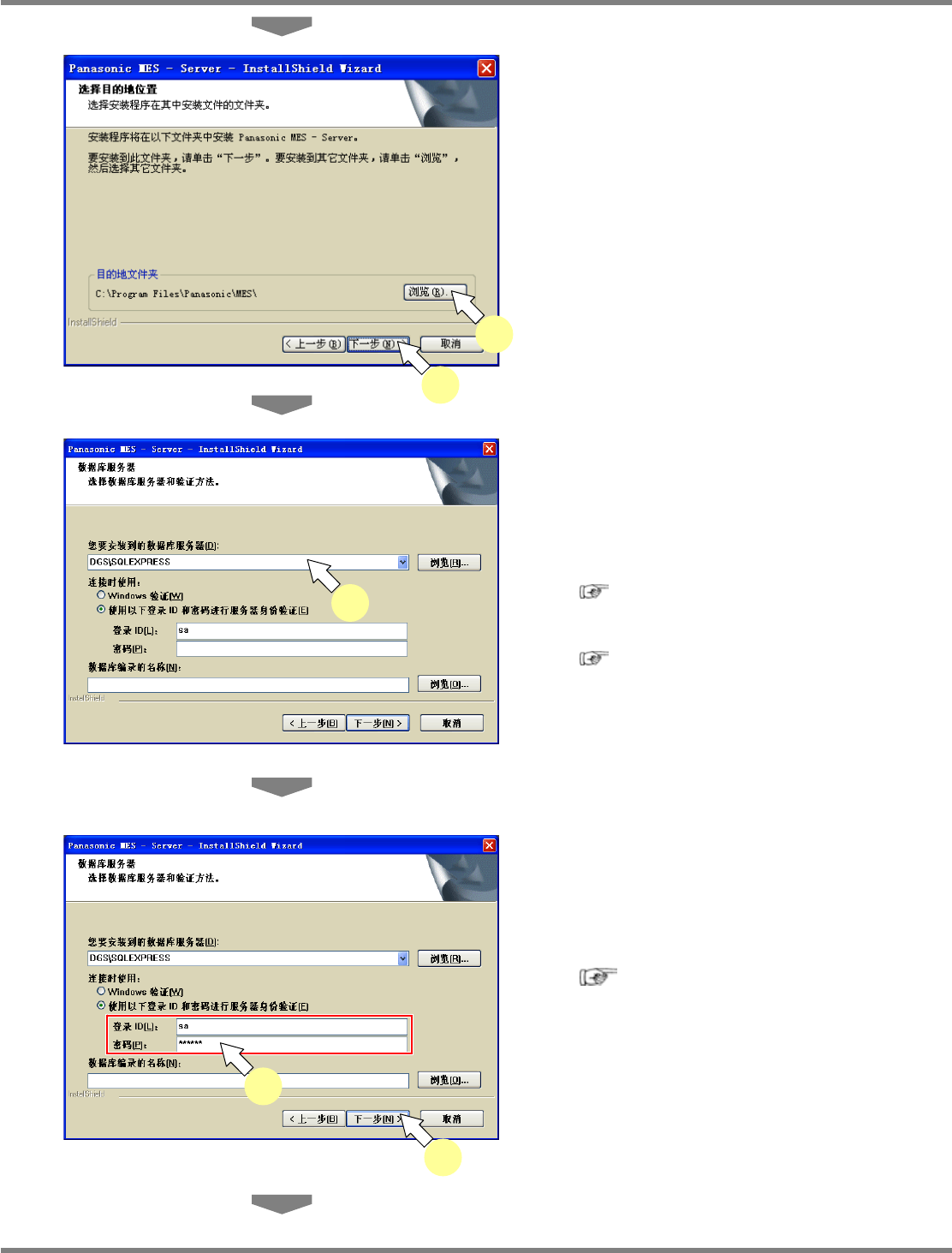 NPM-DGS 程序手册 2.1 NPM-DGS 的安装 EJS9AC-MB-02P-03 Page 2-31 6 需要变更安装目的地时,点击 [ 浏览 …] 选择文件夹。 通常无需变更。 7 点击 [ 下一步 ] 。 8 在 ‘ 您要安装到的数据库服务器 ’ 栏里输 入安装了 SQL Server 2008 的服务器 名。 安装了 SQL Server 2008 的服务器是指安装了 SQL 服务器和数据库的服务器。 ‘2.1.…