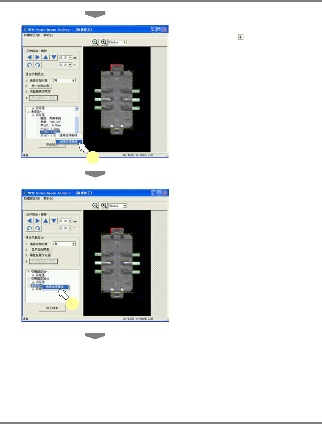 NPM-DGS 程序手册 6.9 使用设备识别错误图像执行识别测试 EJS9AC-MB-06P-08 Page 6-163 8 需要对添加的形状进行微调之际, 展开 设定值 ( 点击 ) ,选择需要变更的项 目后, 或者选择右击菜单上的 [ 选择数据 编辑 ] , 或者点击选择项目, 使之转为编 辑状态后进行编辑。 如果对象为数值,即会转为编辑框; 如果为选 择方式,即会转为组合框;如果为其 他情形, 将会显示设定窗口。 相应所…